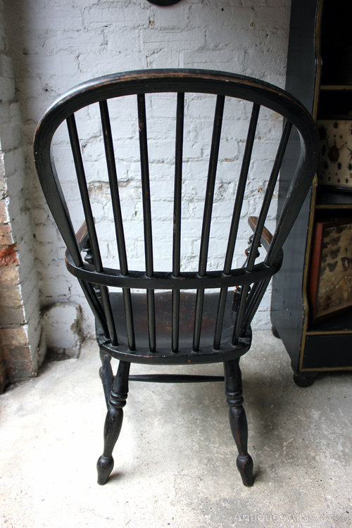 The early Nineteenth century stick back Windsor armchair stick back having a high comb hoop back with turned supports, conforming turned legs, H-stretcher and original black painted finish.