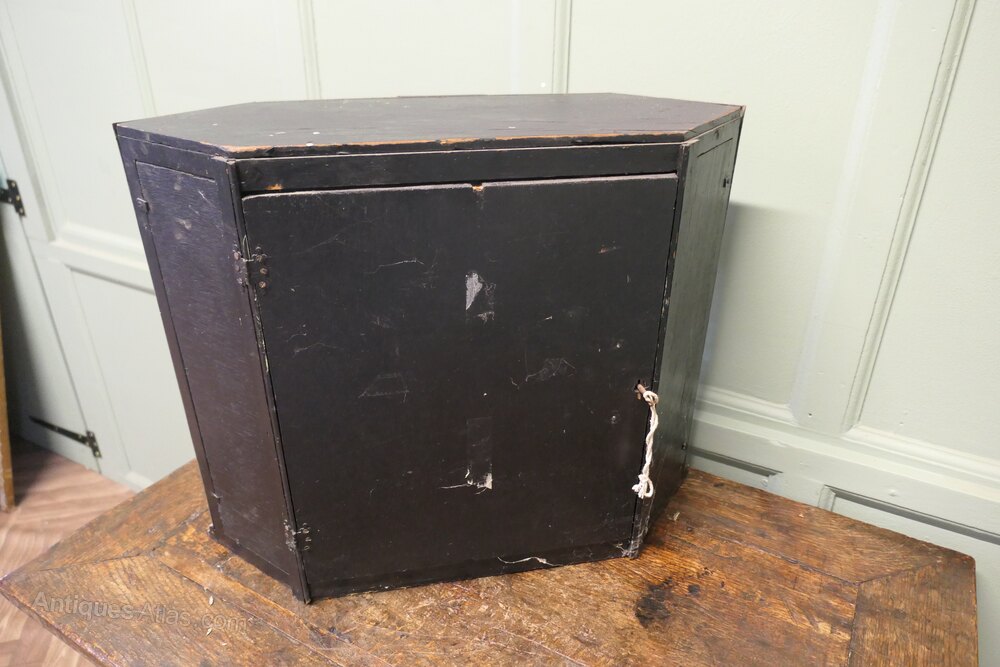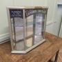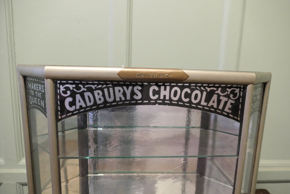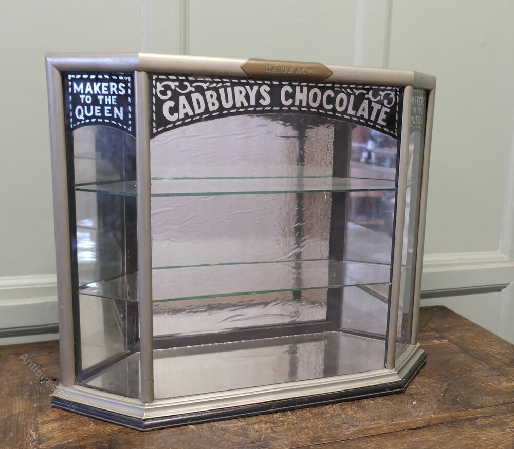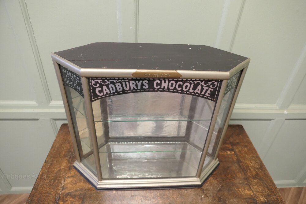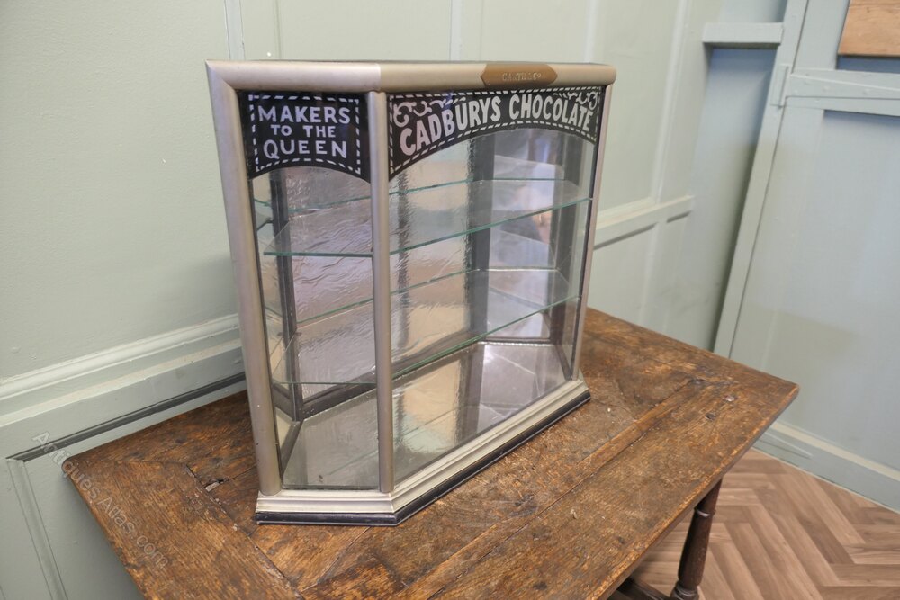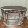 This is a small but Charming Cadbury’s Sweet Shop Display Cabinet it is a counter top piece, from above you can see it is in the shape of a Convex Hexagon, with a small door at each end and it has 2 glass shelves, the glass has reverse Silver Leaf Script