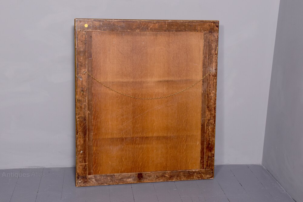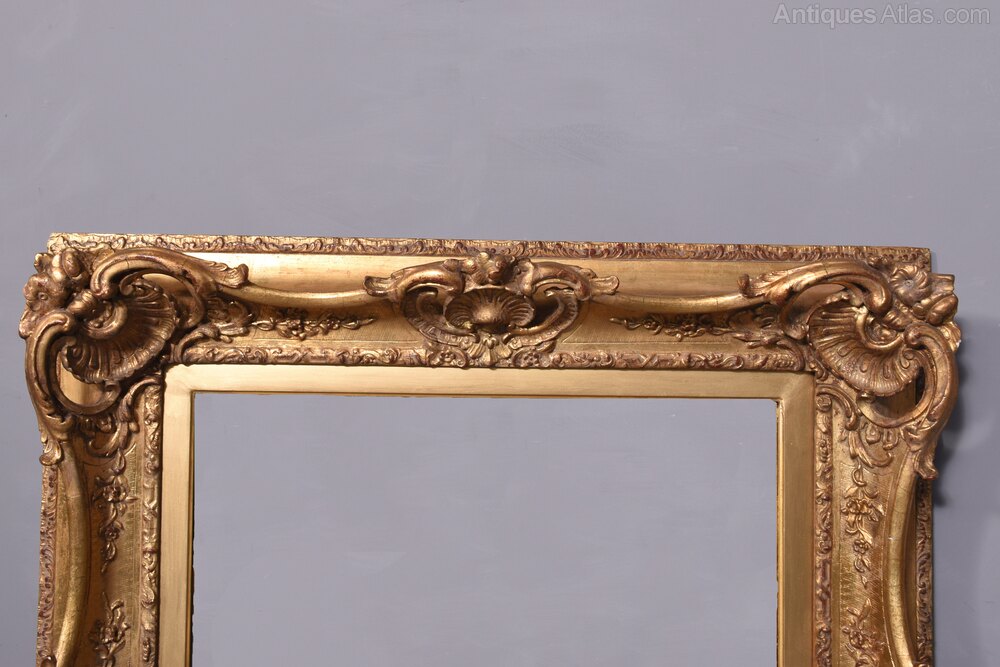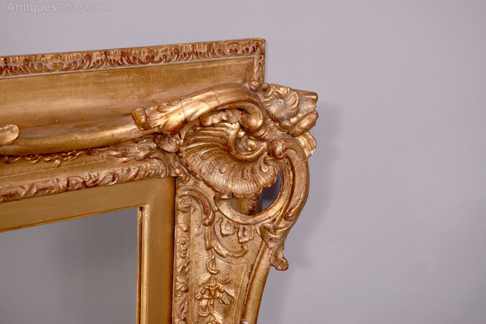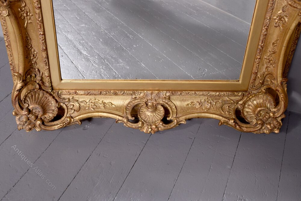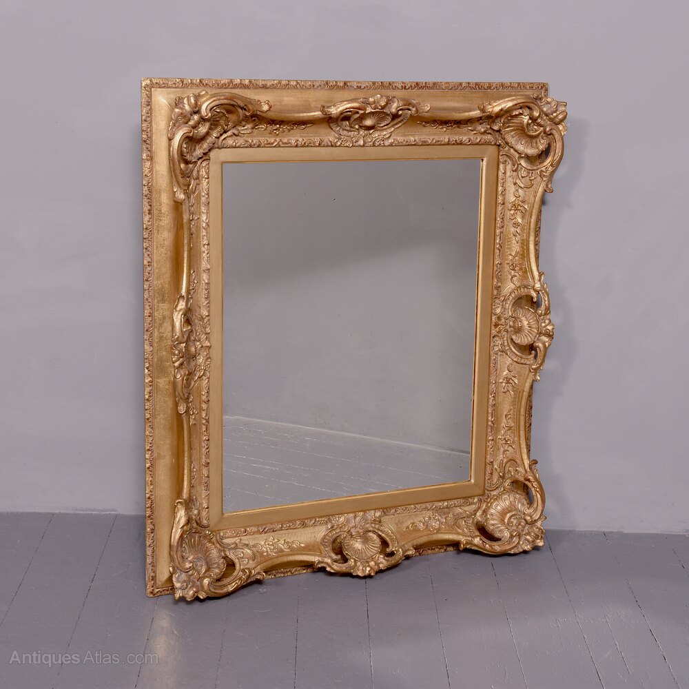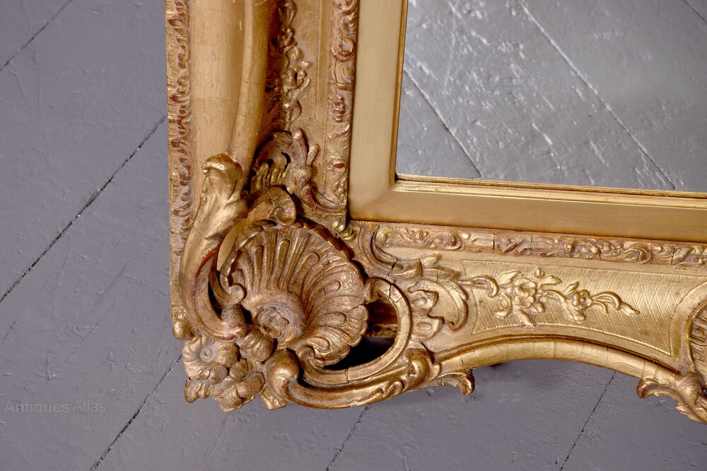 Circa 1870. A quality mid-Victorian carved and gilt mirror, the frame with shell corners and center pierced on each corner with gilded foliate carving on the facing and the front of the frieze, with a new mirror plate which is held in place with a gilt slip. The mirror can be hung either portrait or landscape.
