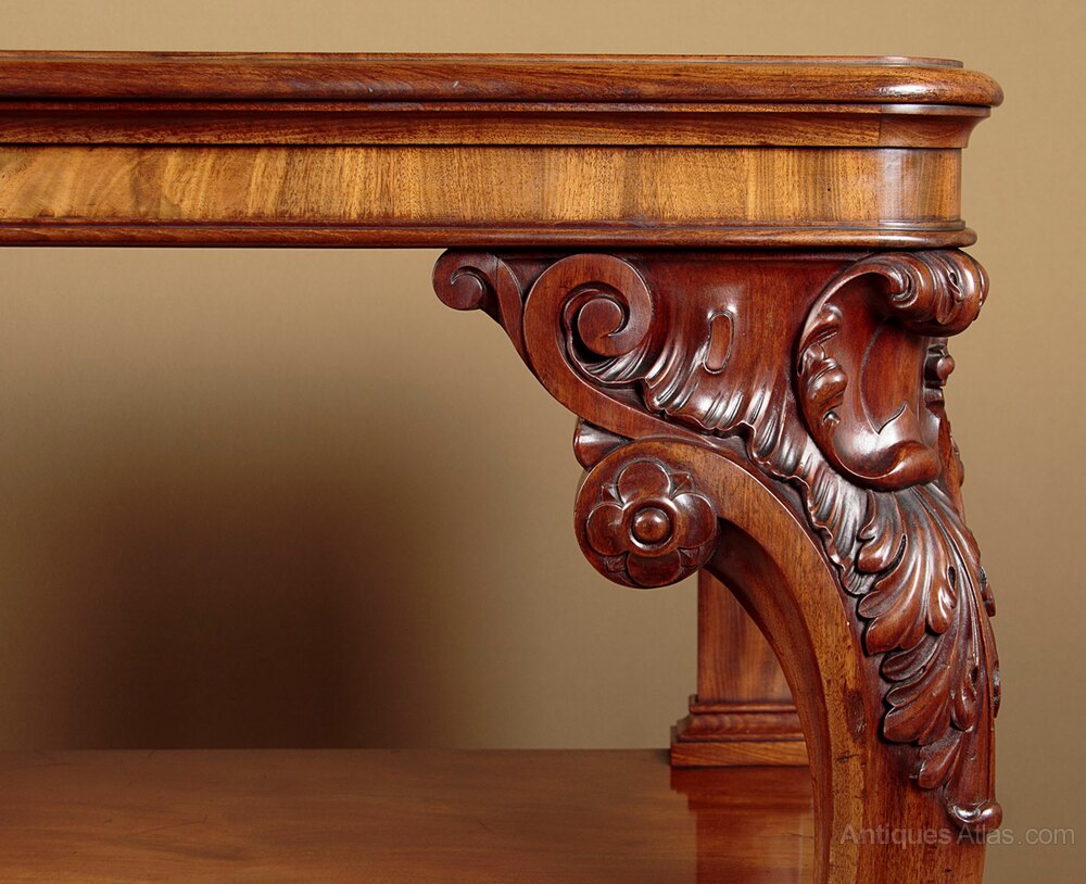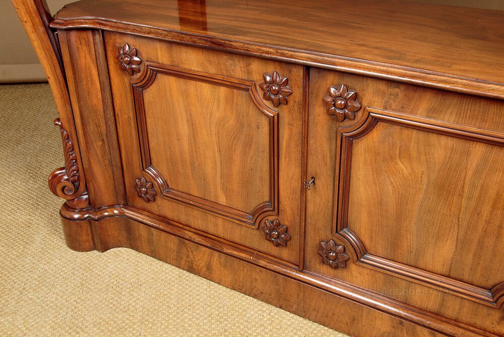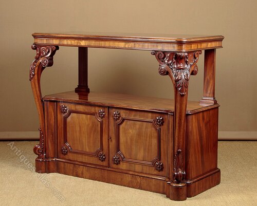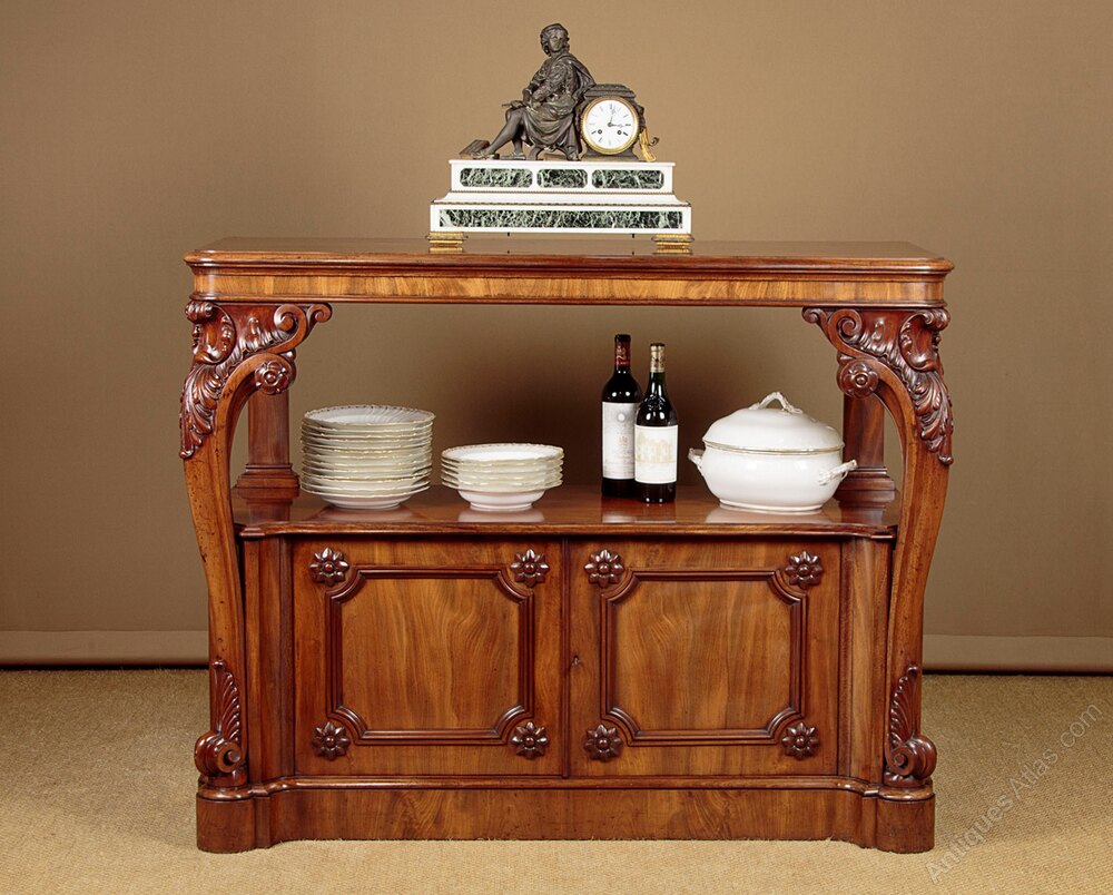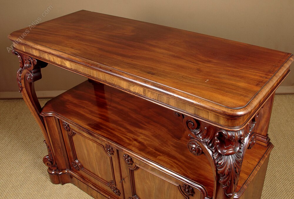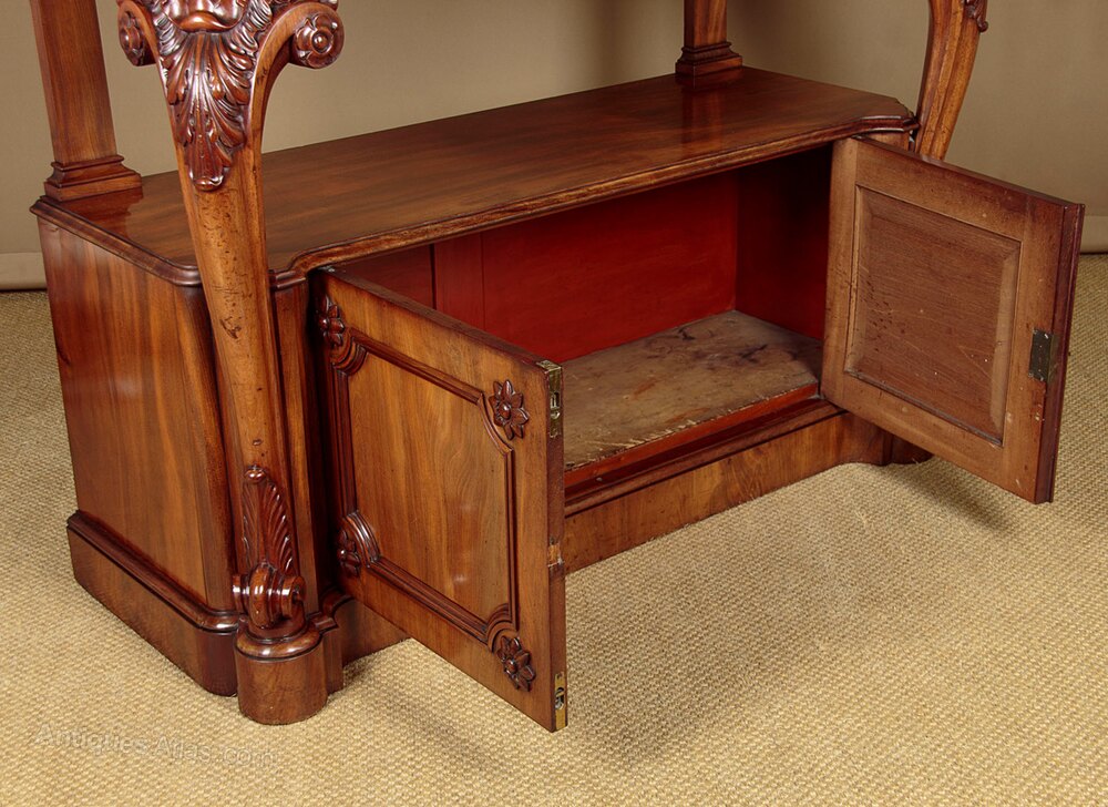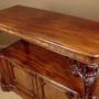 Mid 19th.c. mahogany buffet sideboard c.1860. Solid mahogany top with a thumb moulded edge and crossbanded apron over an open shelf and a two door cupboard below (internal depth 13½"). Large and splendidly carved cabriole front supports with crisp acanthus leaf detail and scrolling feet. Well figured mahogany veneers to the base, with raised mouldings and flower head roundels to the doors. Raised on a tall shaped and crossbanded plinth. Paper label to the rear for the cabinet makers Marsh & Jones of Leeds (became Marsh, Jones & Cribb in 1867). Minor wear to the finish, otherwise excellent colour and condition, cleaned and waxed in our workshops. Key supplied.