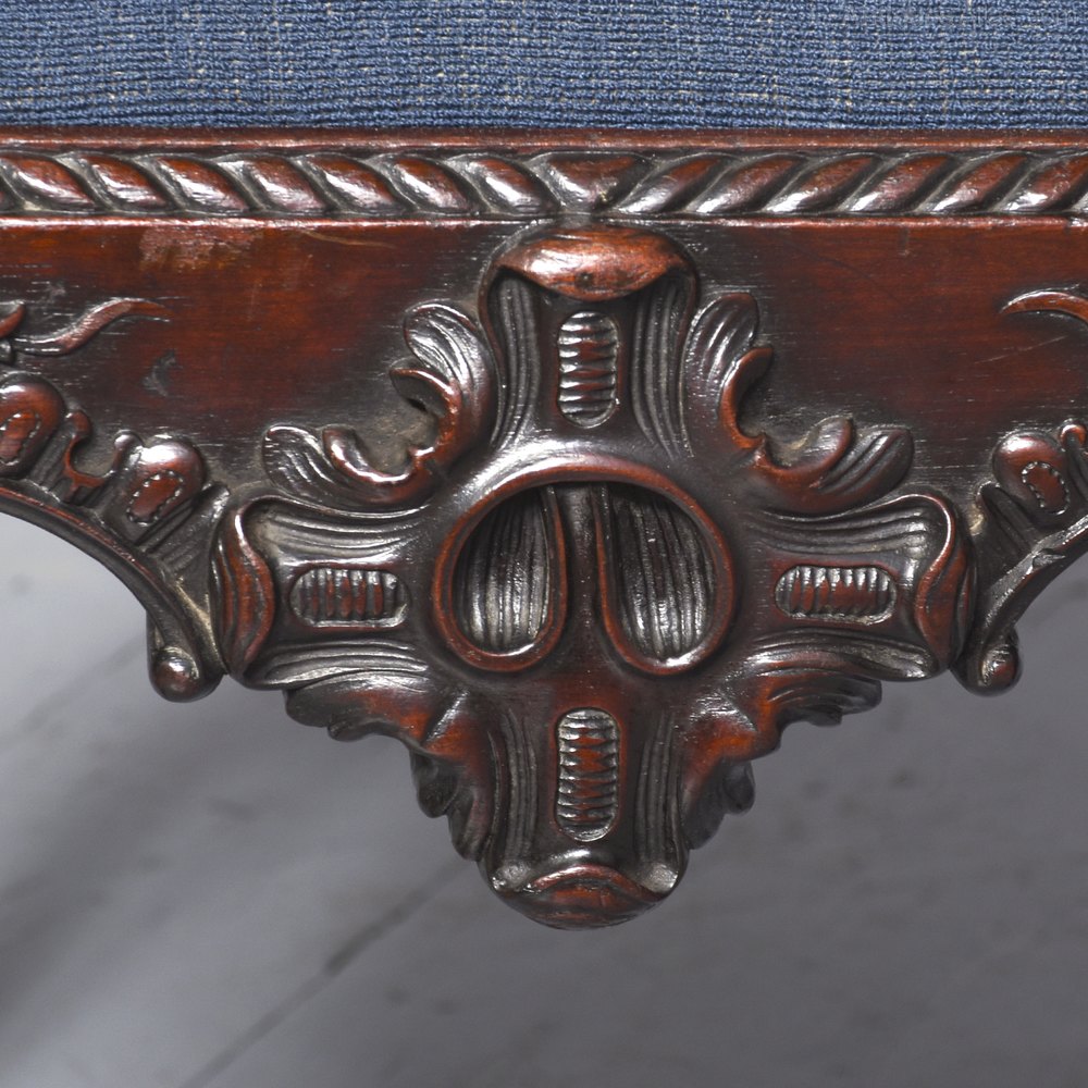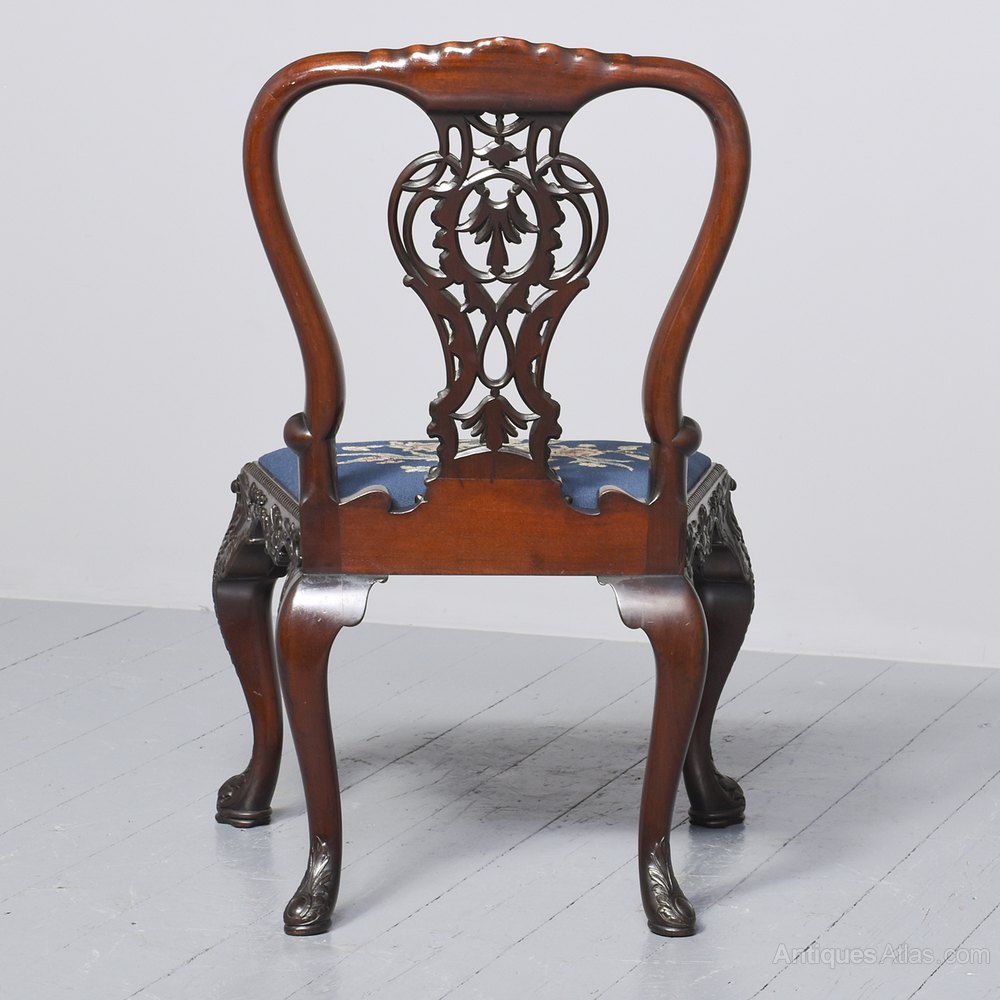 Circa 1890 an exhibition quality carved mahogany chair in the manner of Giles Grendey, the profusely carved chair with carved top cresting rail with foliate carving beneath, pierced carved splat with foliate carving C scrolls and S scrolls, towards the base there’s a solid arched carved as are the two uprights, dropped in navy needlepoint seat, simple seat rail with dragooning to the front and sides, the shaped apron which is carved front and sides, cabriole back legs finishing with a pad foot, with foliate carving, the front legs are most elegant cabriole legs with almost all the carving techniques possible, foliate, floral incorporated into the legs and finished on a well-formed foot with carved oval to the facing, foliate carving up the facing and C scrolls to the back.