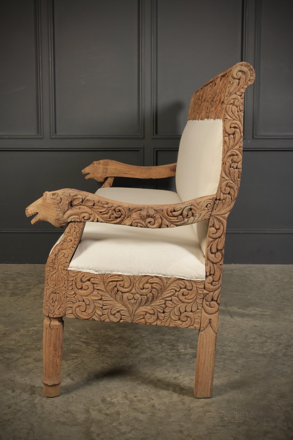 A rustic light raw oak bench smothered in decorative carvings, with monkey heads on the arm rests and lovely fluted legs.