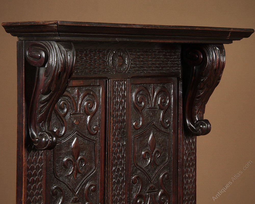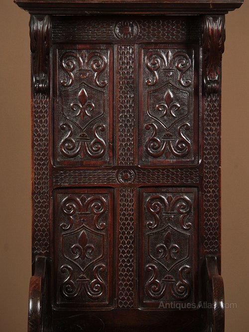Unusual 17th.c. style carved oak hall seat or porter’s chair with storage c.1880. Tall backrest topped with a moulded canopy supported on large acanthus leaf corbels. Panels carved in relief with a heraldic fleur-de-lis motif within a shaped cartouche and scrolling elements. Unusual fishscale carving to to the rails and mullions. Low shaped arms, carved on both sides, over a loose board seat which lifts to reveal useful storage below for shoes and boots etc. Further panels below the seat to match the backrest. Raised moulded and scratch carved side panels. Raised on turned bun feet. Excellent colour and condition, cleaned and waxed in our workshops.
