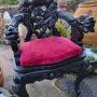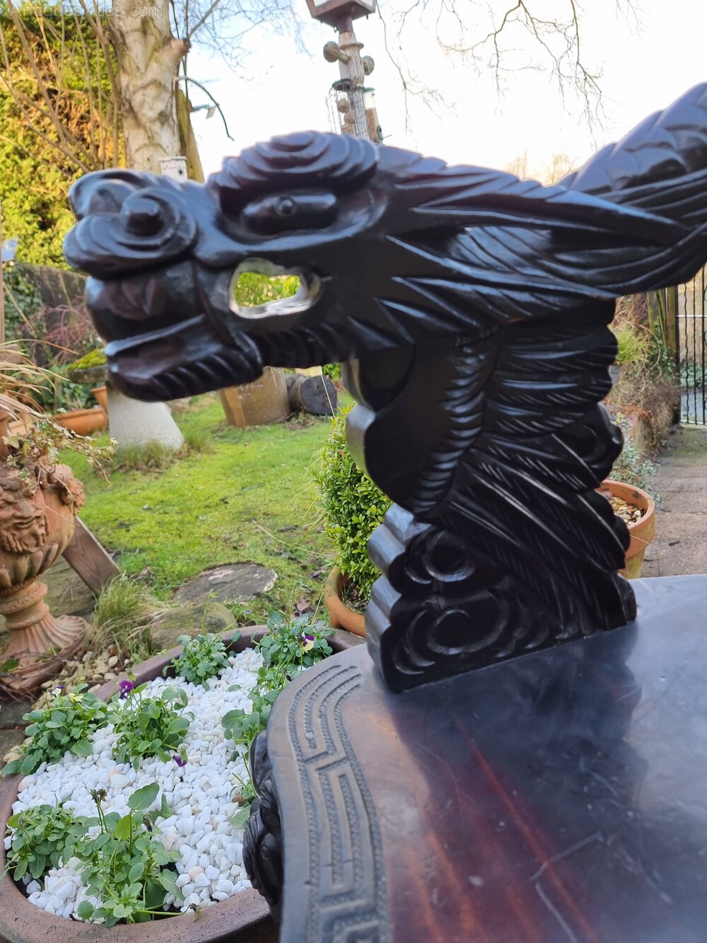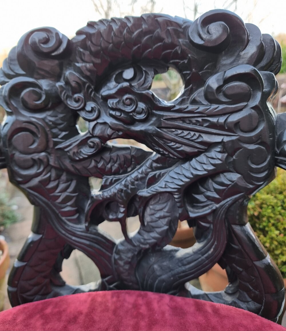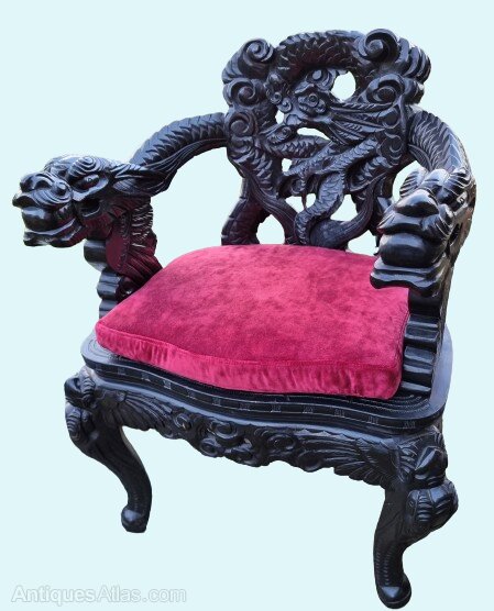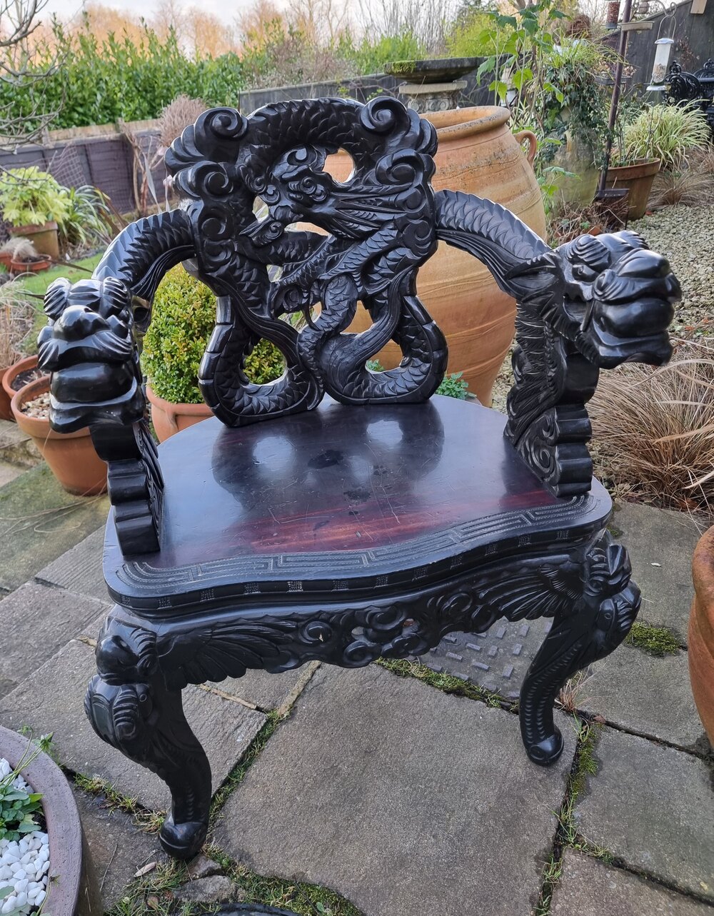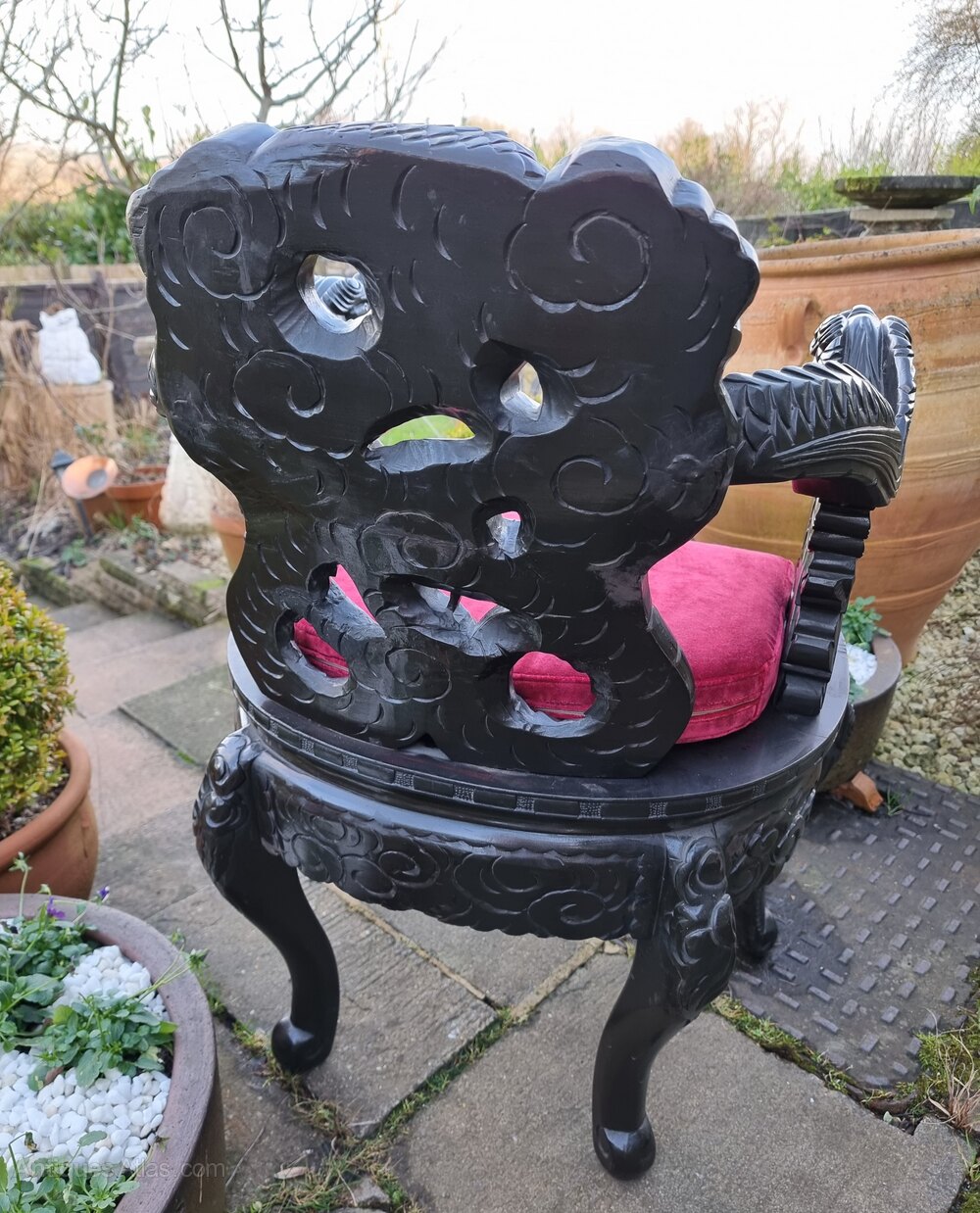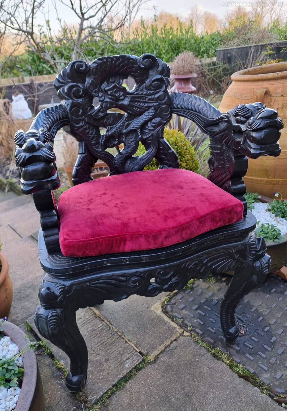 A carved Oriental hardwood armchair with highly decorative carving including dragon head arms, carved back with further dragon head, cabriole legs and solid wood seat.