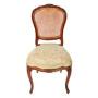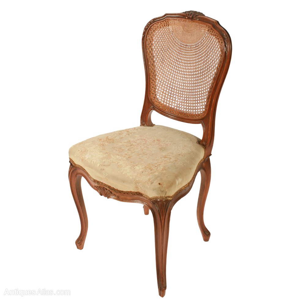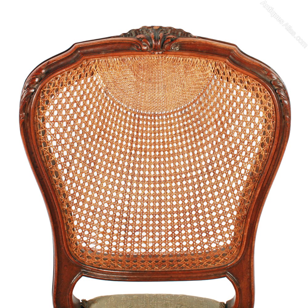 The chair has a shaped woven cane back with a decoratively carved top rail and an upholstered seat.