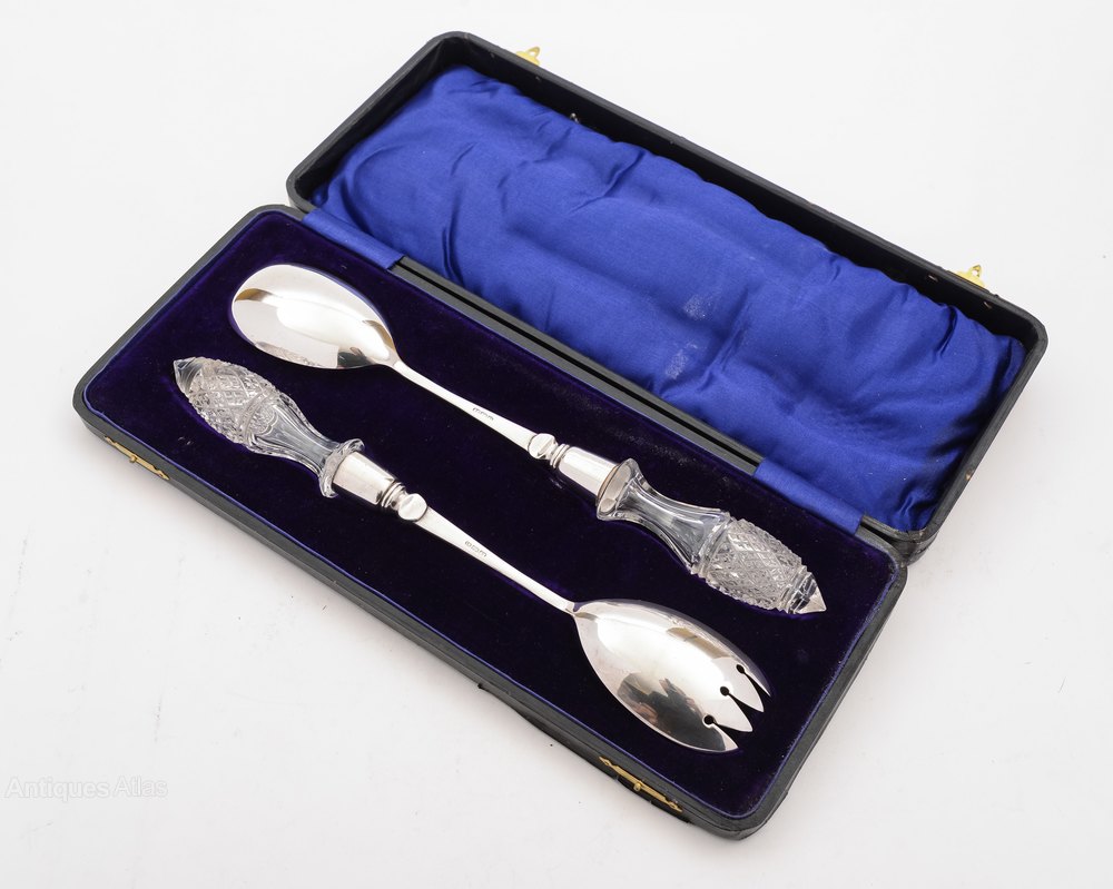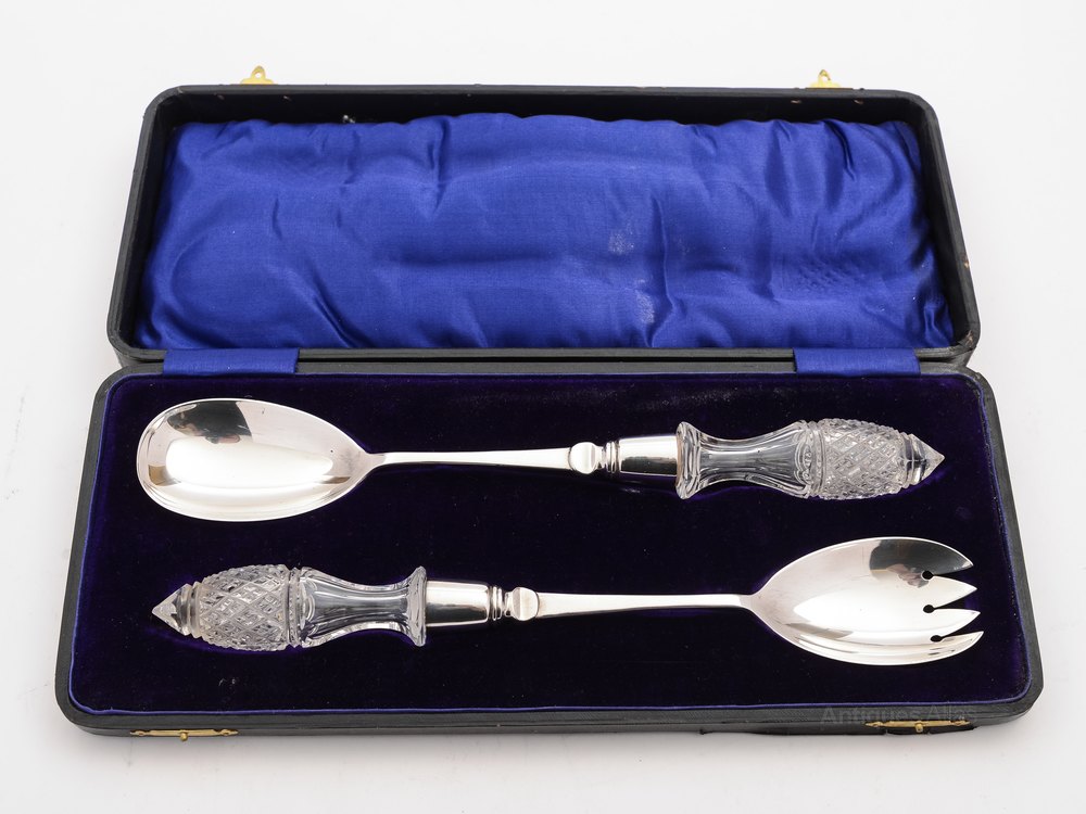A good pair of English Edwardian silver plated salad servers with cut glass handles. Presented in original blue silk and velvet lined case. Circa 1905.