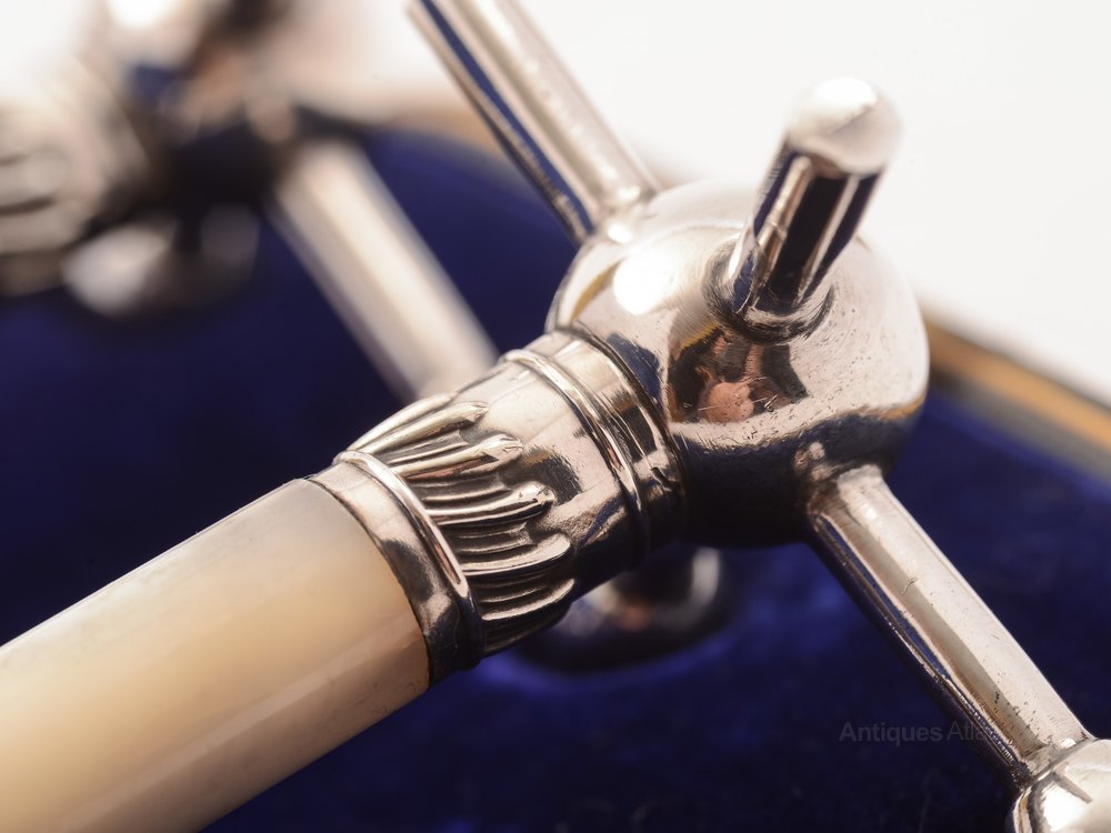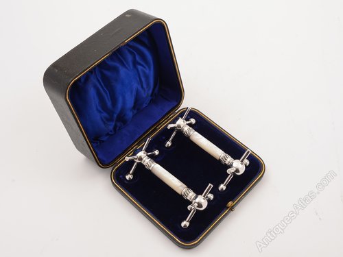A good pair of cased English Edwardian mother of pearl and silver plated knife rests. Presented in original velvet and silk lined box, circa 1905.
