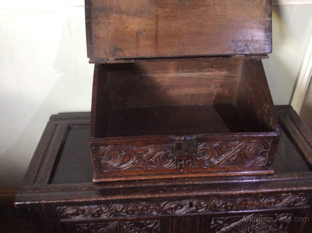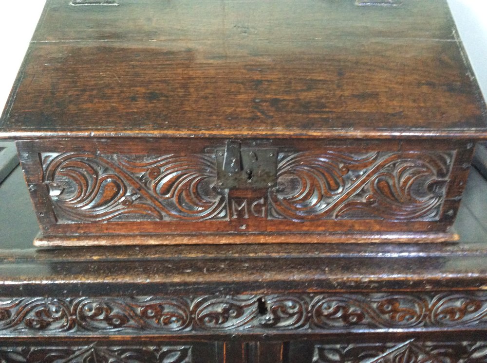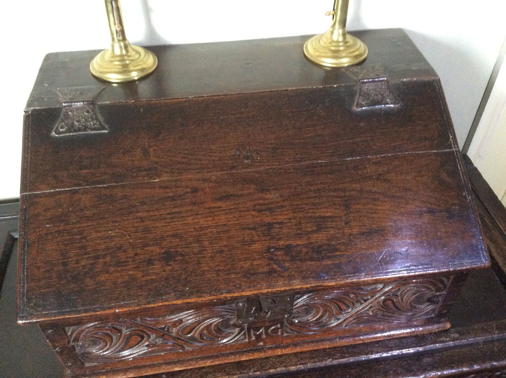 A late 17th Century carved desktop Bible Box with initials 'MG', Good colour and patination. Provenance from the recently dispersed Derbyshire 'Robinson' collection. A useful and decorative storage piece.