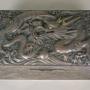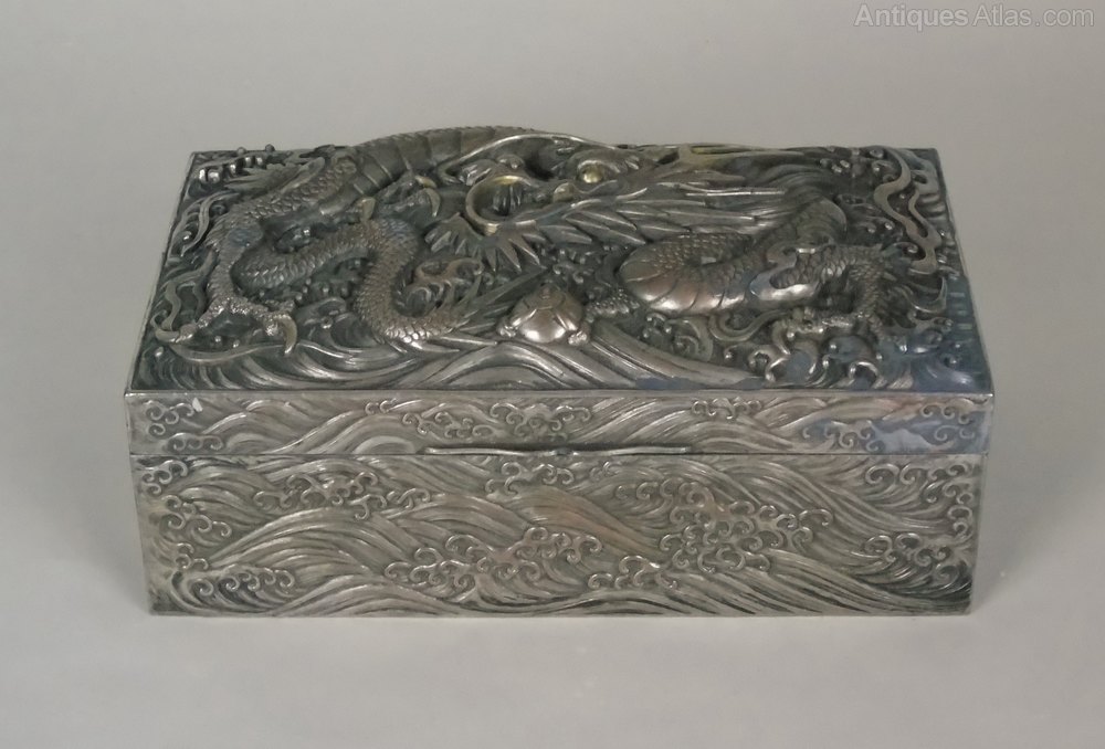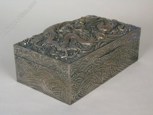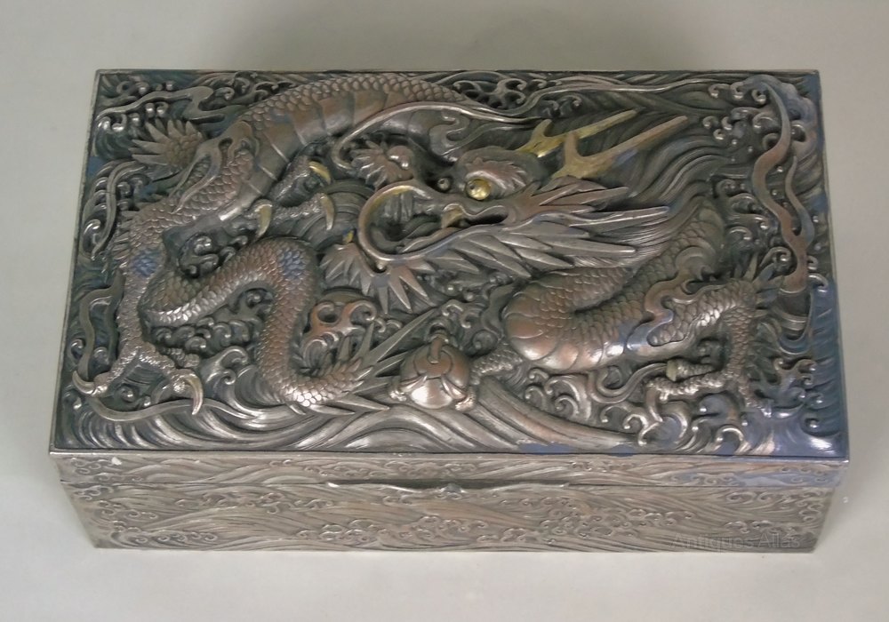 This is a beautiful early 20th century Chinese table casket or antique jewellery box with stunning dragon design dating from around 1920. The lidded box has a deeply cast Chinese dragon clutching the flaming pearl with brass highlights to the eyes, teeth horns and claws. It has very fine detail to the design throughout with stylised ocean waves to all four sides. The box is lined in sandalwood and is in excellent clean condition. This measures 23 cms long 13.5 cms deep by 9 cms high.