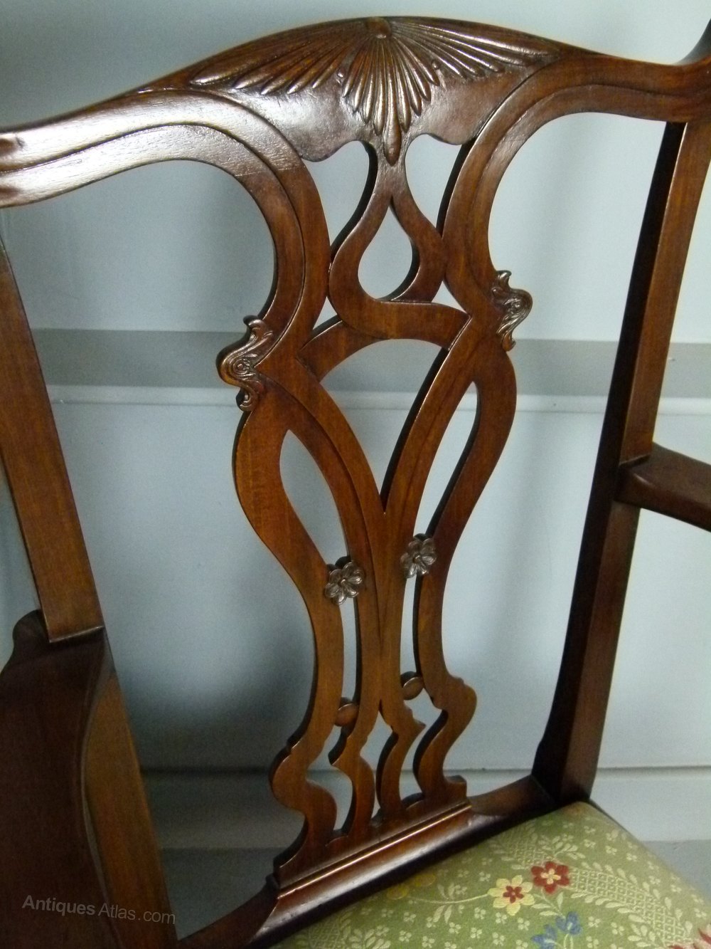 Lovely design, having a pierced carved splat-back, with scroll ribbon decoration, featuring floral and acanthus motifs.