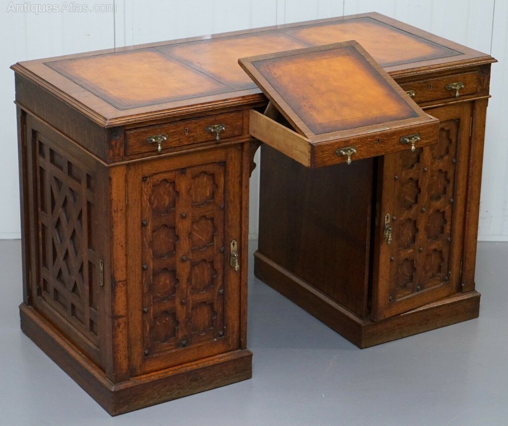 Wimbledon-Furniture is delighted to offer for sale this exceptionally rare Gothic Revival circa 1840 solid oak partner desk with top drawer writing slope and side bookcases made by either Gillows of Lancaster or Pugin