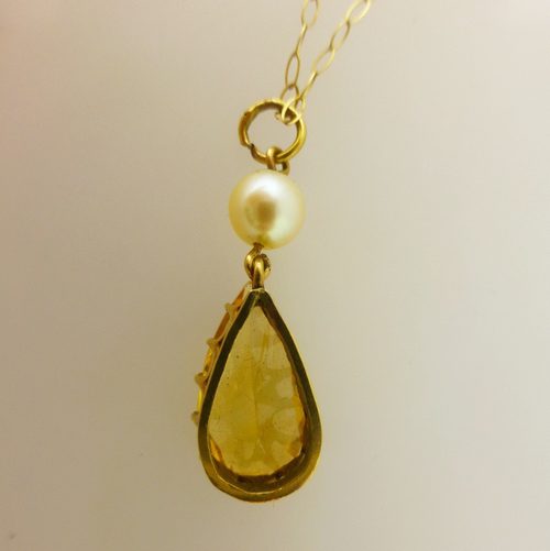 A beautiful citrine and pearl pendant set on a 9ct rose gold chain. The stone is tear shaped and claw set with facet edge.