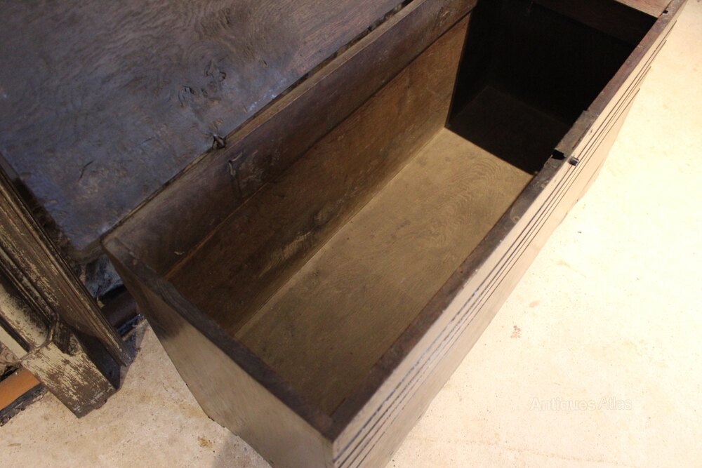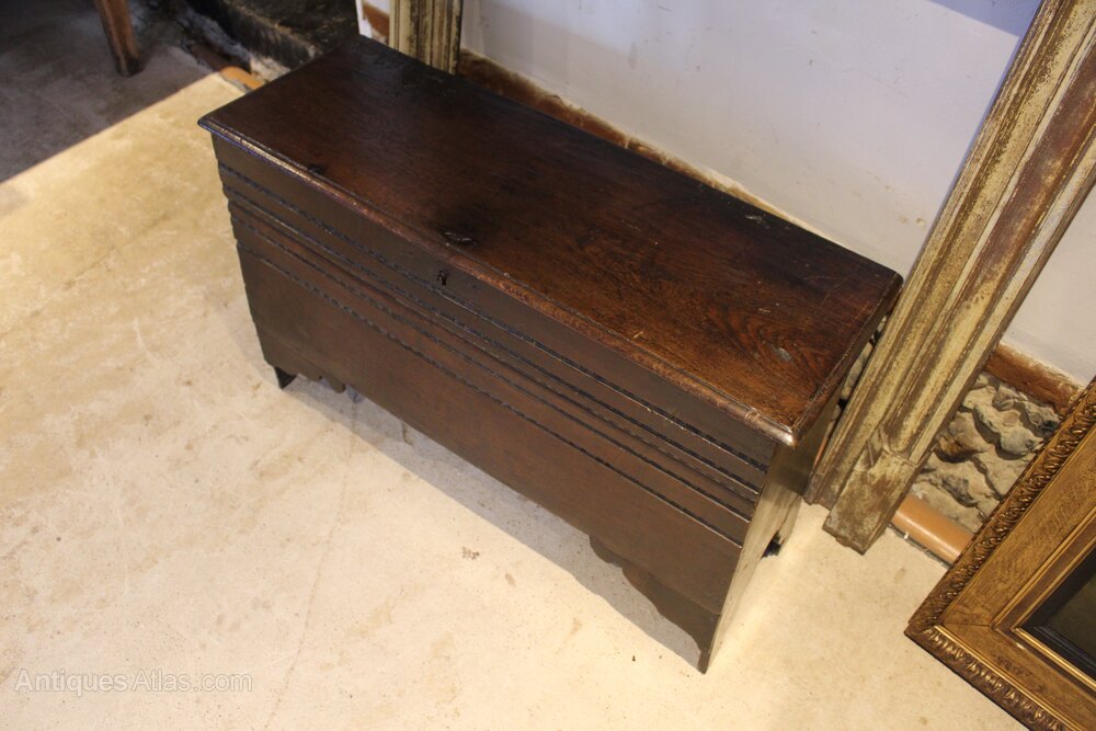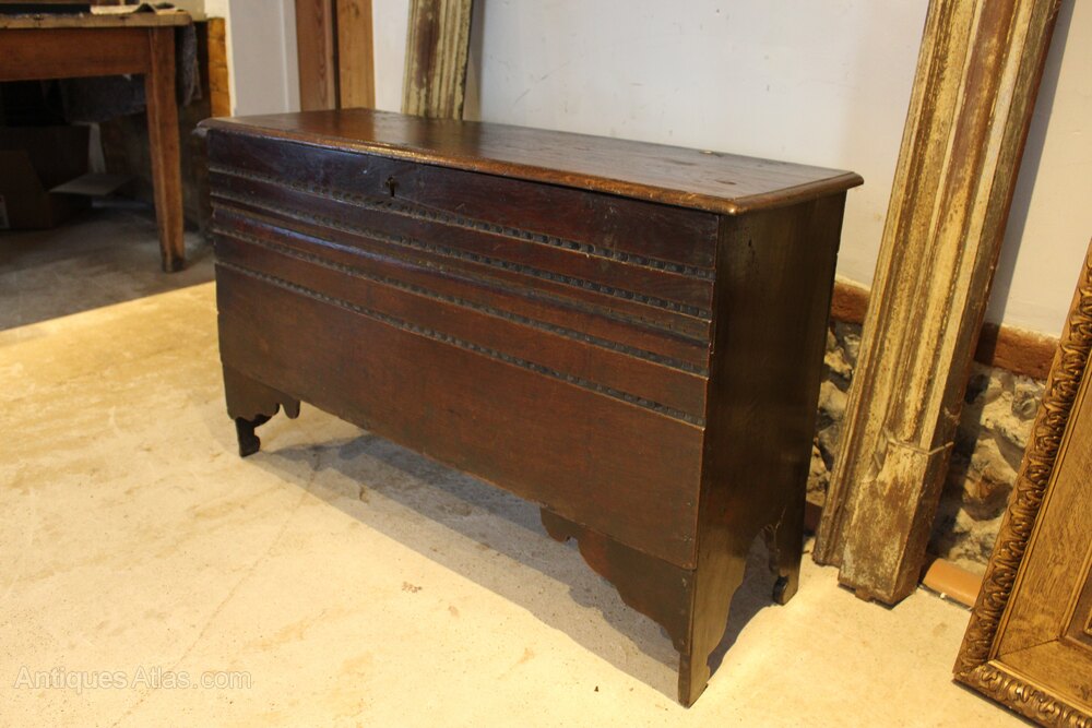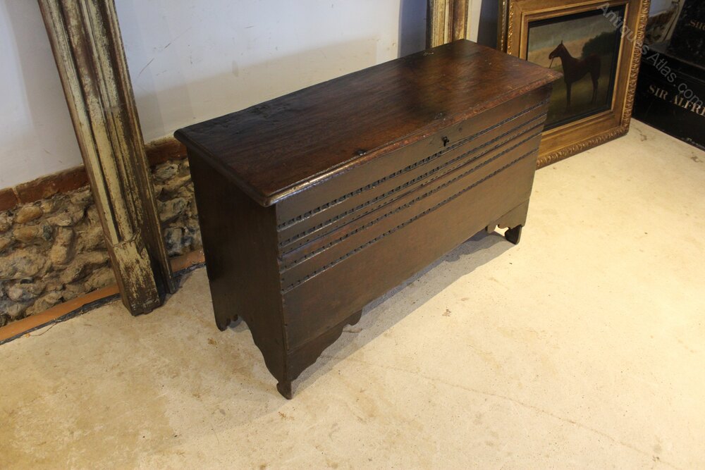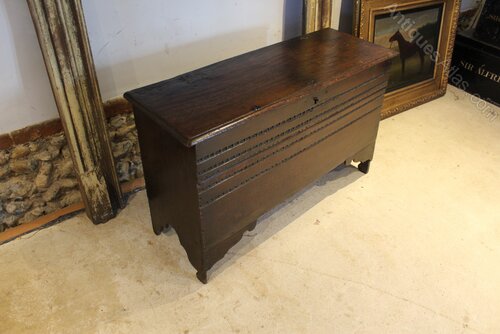 Here we have a rare 17th century Oak six plank coffer c1690. As you can see the coffer has fantastic colour and patina. There is a single plank top with thumb moulded edge. The top has the original loop and pin hand forged hinges. There is a rare and unusual chip carved decoration front plank with shaped spandrels below. The single side planks also replicate the shaped front spandrels. Single plank to the back and base and in wonderful retail condition ready for your home. The dimensions are particularly good being only 99 cm wide 62 cm high and 35 cm deep.