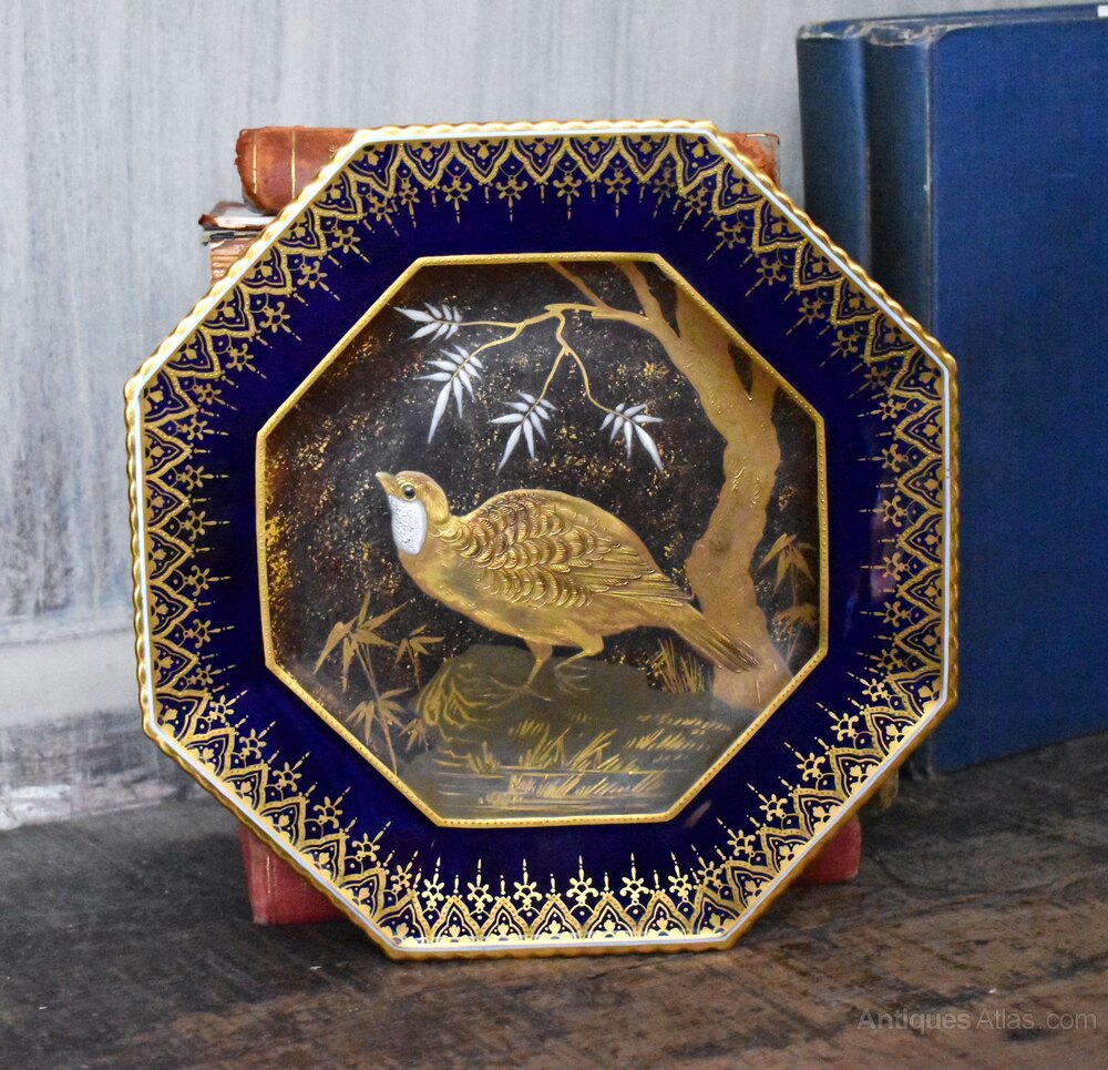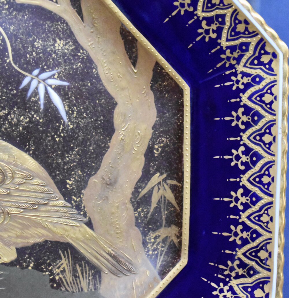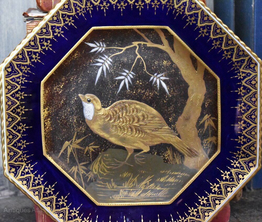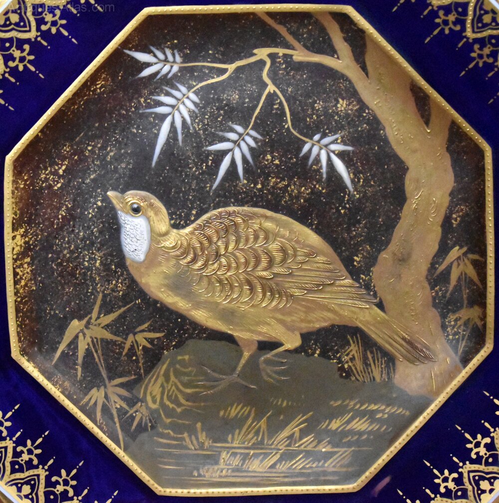 An exceptionally fine Copeland octagonal plate in jewelled cobalt blue with central design representing a quail or partridge. The decoration is superb with wonderful raised gilding over the cobalt blue glaze. The central panel most probably replicates Japanese lacquer with enamel on a powder gilt ground. The plate is marked with the Copeland mark and pattern number for C.1880. The piece was most likely decorated by the celebrated Copeland artist Charles Brayford known for his talent with gilding and birds (active 1878 - 1887) as similar examples with his signature are known. The plate is in excellent condition and a superb example of late nineteenth century porcelain.