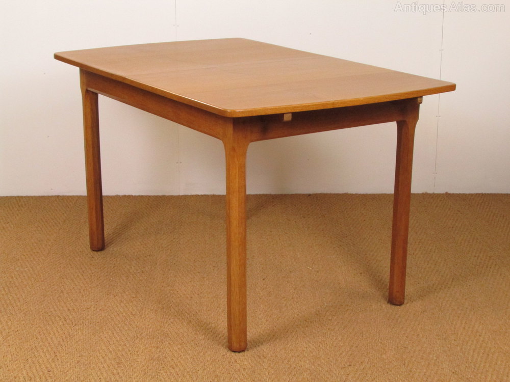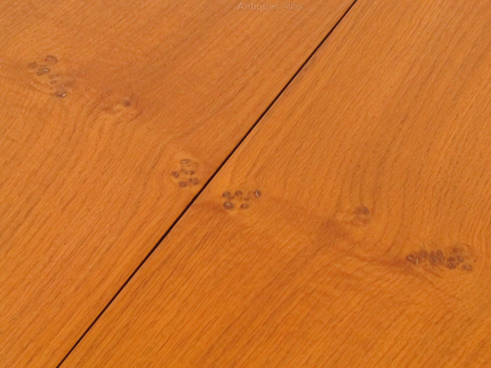 An Arts & Crafts oak Cotswold School extending dining table by Theo Dalrymple. Constructed in solid well figured quarter sawn oak with some "pippy" or "cats paw" interest to the grain. The table has octagonal shaped supports and exposed dowel construction. The table ends slide out to accommodate a central leaf.
