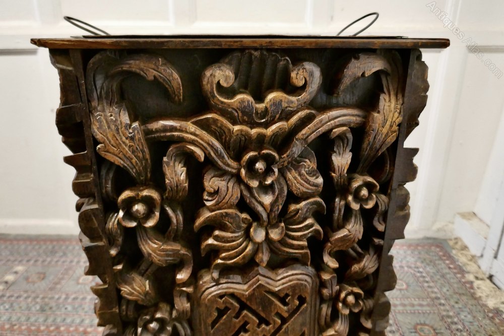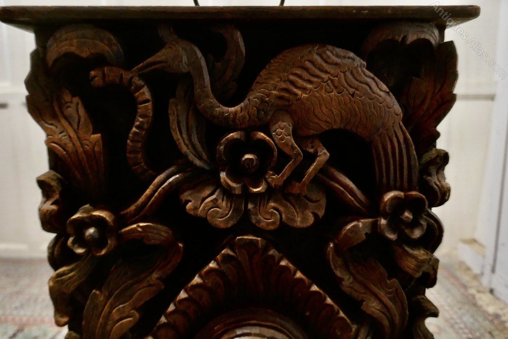 A wonderfully carved piece, the stand is made in Oak it has 4 sides, all of which are deeply carved with mythical beasts and fruits of the forrest