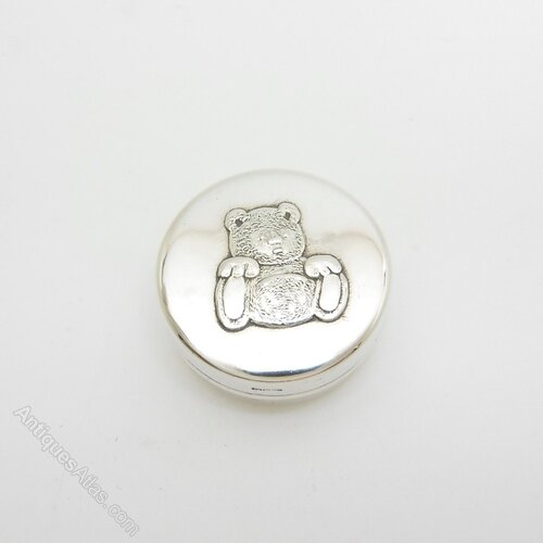 A delightful vintage silver pot with a teddy bear design in relief on the lid. The lid pulls off easily and both the pot and lid are lined in black felt. This cute silver pot would be a hit with teddy bear fans, could make a lovely Christening present, or how about using this as a tooth fairy pot?