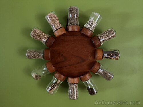 A 1960s rotating teak spice wheel from Denmark with 12 screw on glass jars with original labels. Fabulous in the kitchen for organising your spices, it would also work well as stylish storage of any small items such as craft supplies. The wheel is made of solid teak with beautiful grain, and is designed to be wall mounted. It comes in its original cardboard box, and currently has its original spices (not sure how old they are, I wouldn't recommend eating!) - these can be included in the sale, or I can discard and thoroughly clean the jars as preferred.