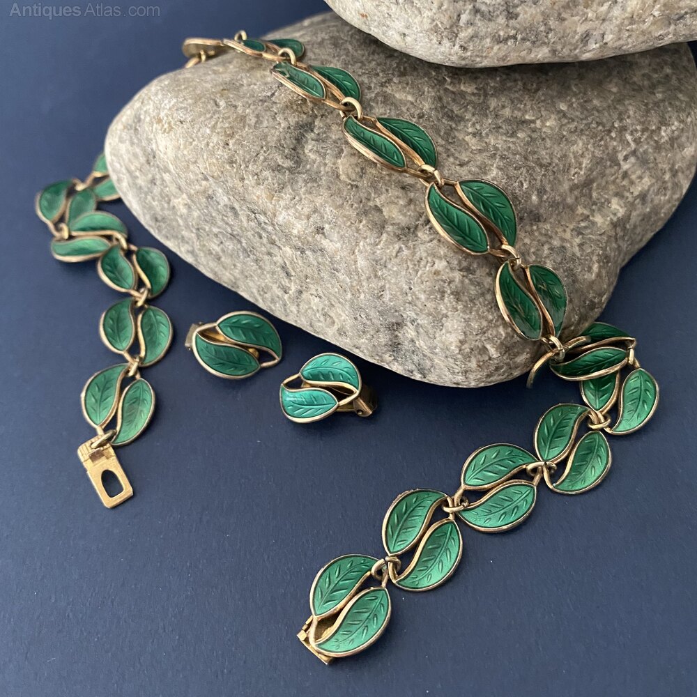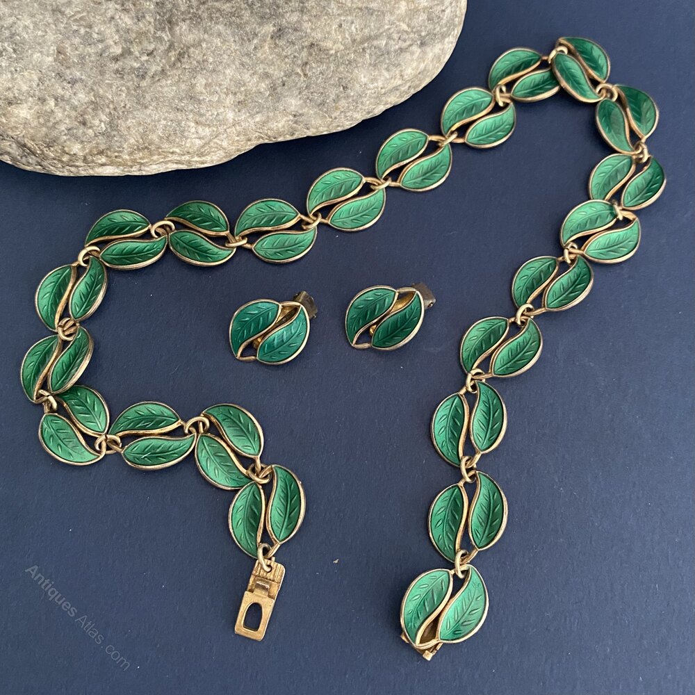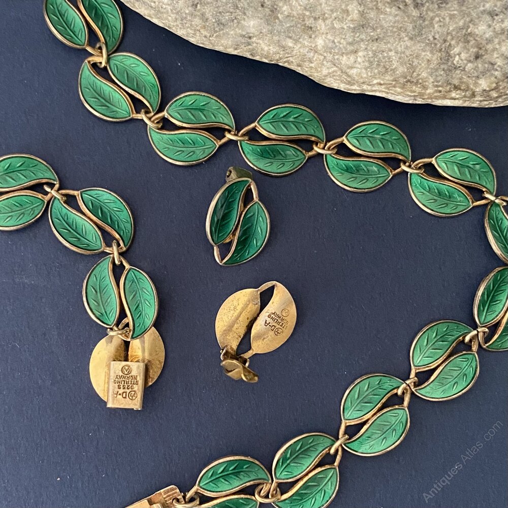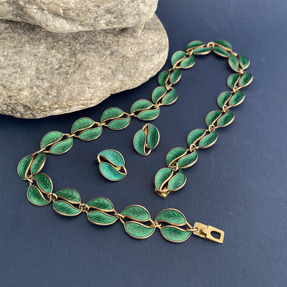 A beautiful mid century David Andersen Norwegian sterling silver and enamel necklace with earrings. This lovely necklace has twenty two twin leaf links enriched and enamelled in a gorgeous emerald green. The associated earrings are clip backs and all are in immaculate vintage condition.