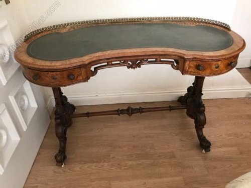 Desk kidney shaped burr walnut with inlays and leather top Superb desk, consider mid 19th century, lovely colour inlays are superb has original casters the draw locks have been changed in the past for better quality ones, all round this is one of the best desks for sale, length 125cm height 77cm to top of rail depth being 58cm, offering free UK delivery, worldwide buyer ask for your destinations costs.. Tel: +44 7505 165 843 We accept online payments for all our items listed: Bank transfer cash on collection personal cheques or if wishing over the phone using your debit or credit cards, also doing layby payments plan, or email giving your address details & contact number and we shall send you your items invoice to make payment with your card. Send your request to - john.strong2@gmail.com