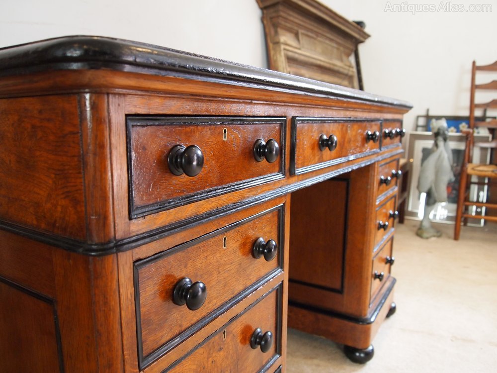Here we have a wonderful rare burr and Pollard Oak three part twin pedestal Victorian desk c1860. As you can see the desk has great colour and patina. The top has a beautiful polished leather skiver with a tooled and gilded edge. There is a crossbanded Oak edge and Ebonised thumb moulding. There are further Ebonised mouldings to the edge of the drawers, bottom of the plinths and on the edge of the fielded panels. The Ebonised finish is also replicated on the bun feet and turned wooden handles. This fine quality desk has stunning burr and pollard Oak drawer fronts and solid Mahogany linings including bases and dust beads. There is a configuration of 9 drawers to the front and the rear has three faux drawers and two cupboards so the desk could be stood in the middle of the room. The dimenions are approx 130 cm wide 69 cm deep and 79 cm high.