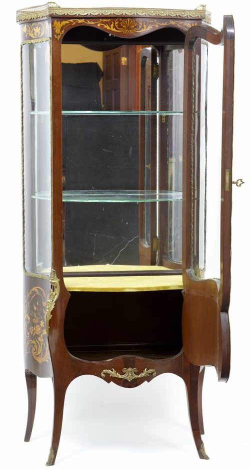 Inlaid kingwood and marquetry display cabinet with two glass shelves.