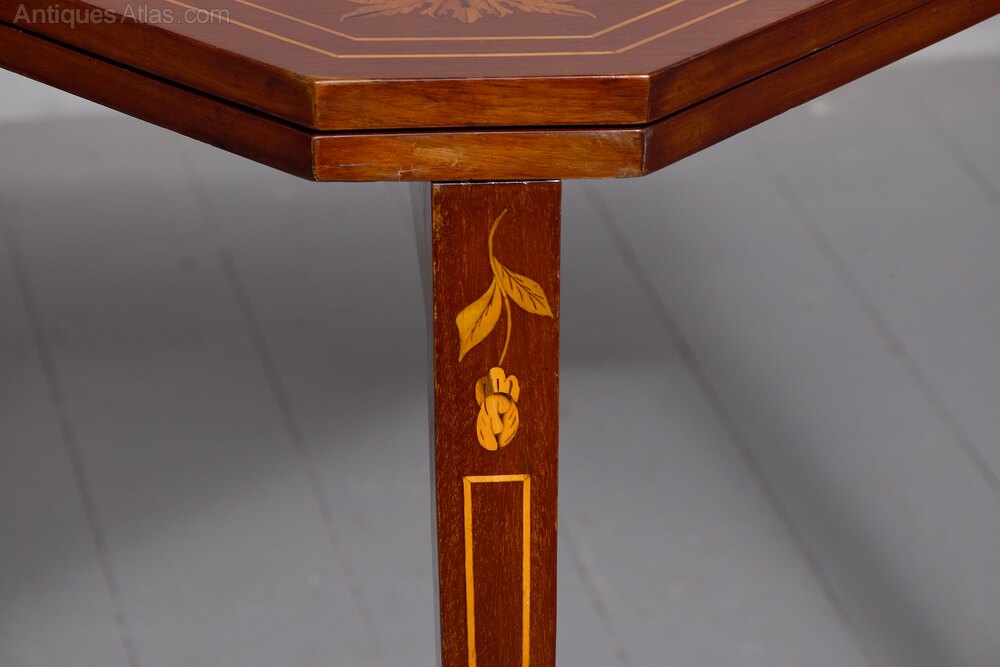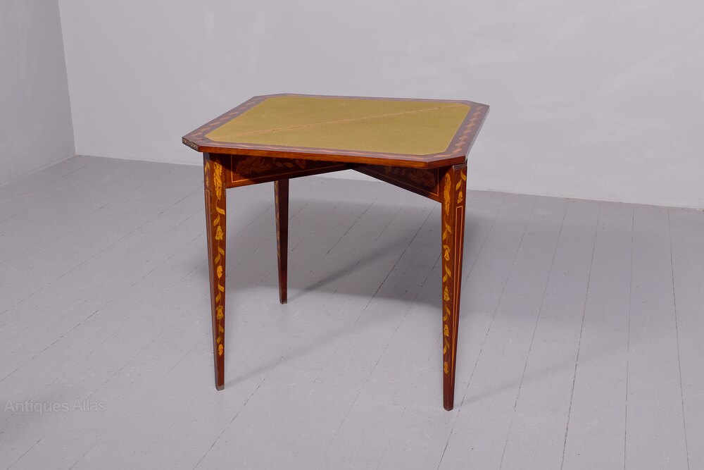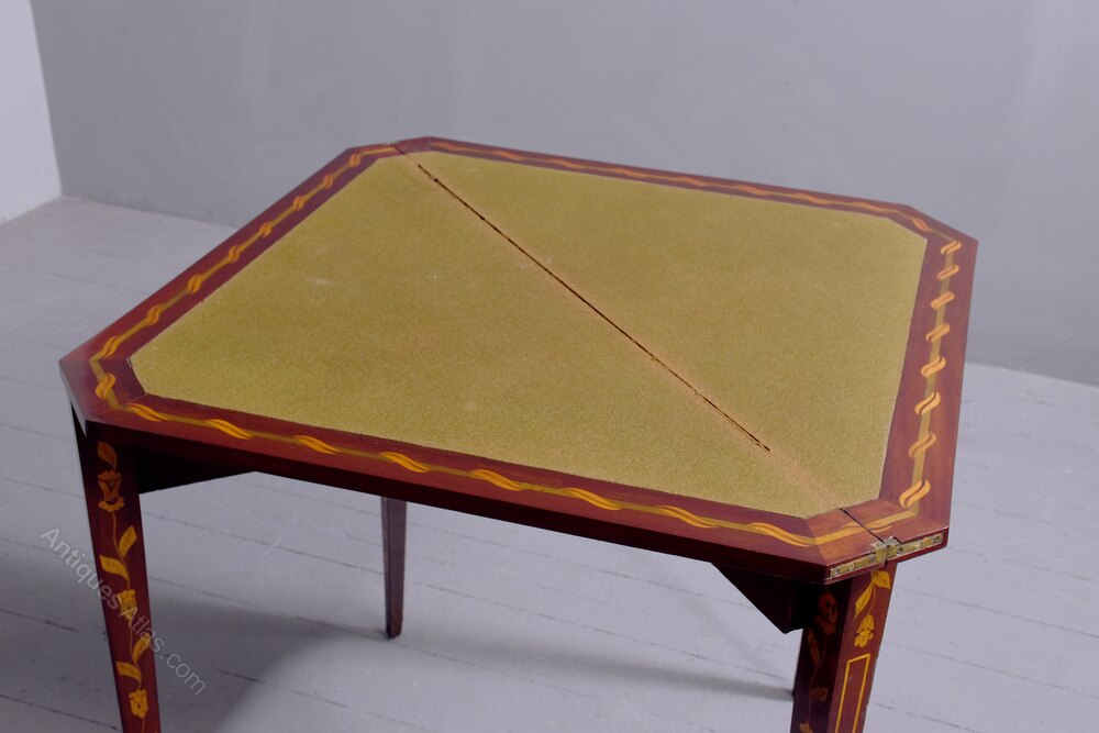 Circa 1820. An unusual interesting and stylish Dutch triangular shaped fold over card table, the top with canted corners, smothered in marquetry framed with double satinwood banding, the hinged top opens to reveal a green baize lined interior, inlaid with green wood and entwined with foliate inlay, resting on four square tapering legs which are smothered in marquetry as are the two hinged back rails which swing out to support the top when open. The interesting thing is the table can be folded down flat when not being used.