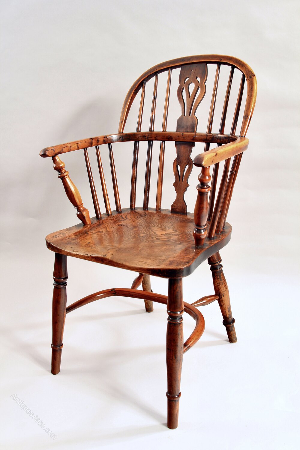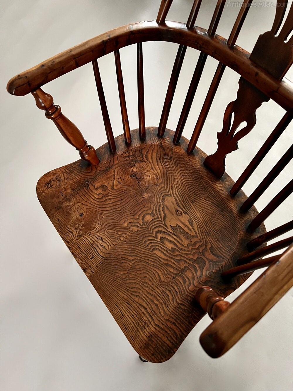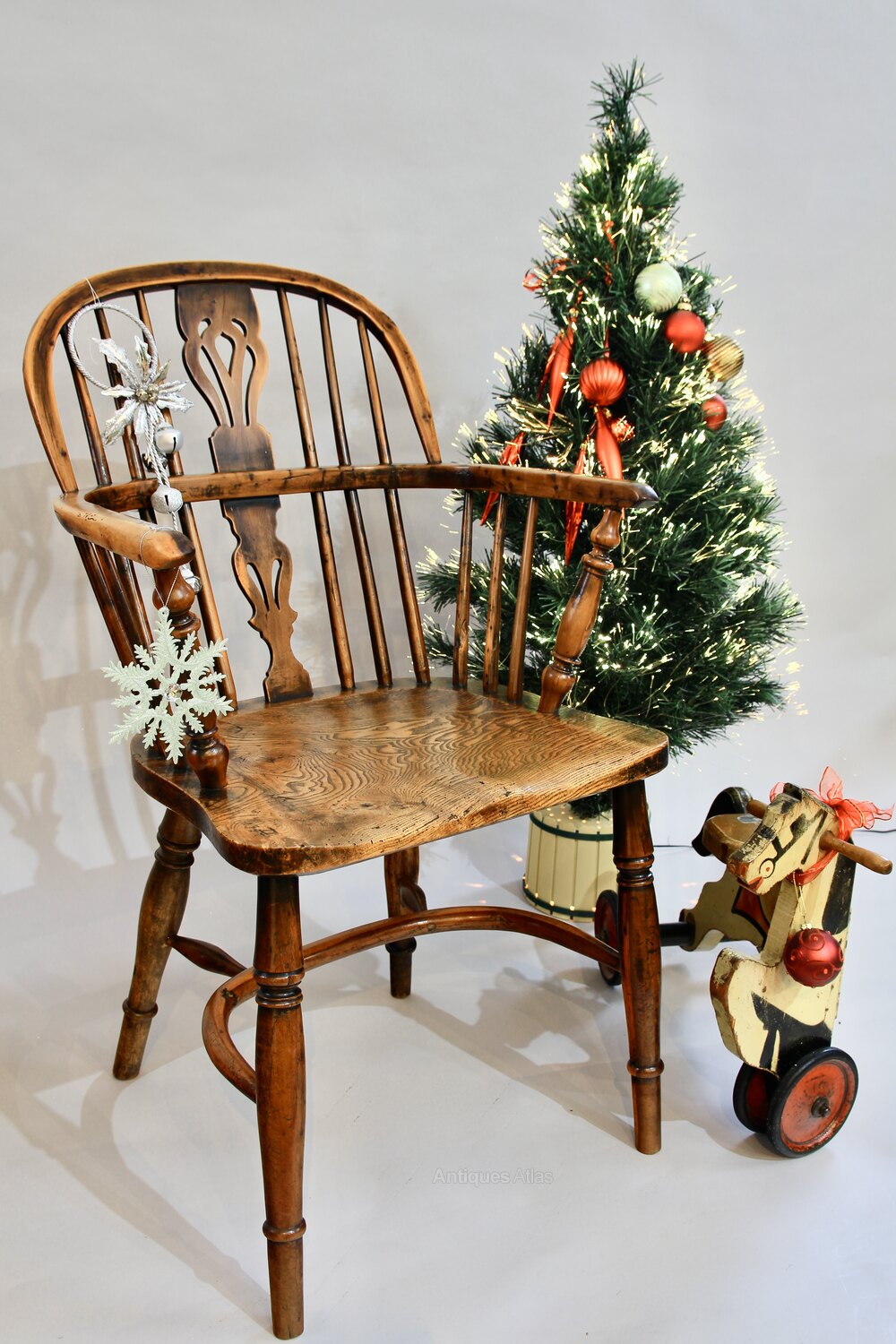 Sit and enjoy the Christmas cheer in this fine early 19th century yew wood Windsor Armchair. The art of bentwood chairs came to a height at this time, with the top and back rail, and the crinoline stretcher below the seat, all made of yew wood carefully bent to make the chair. The seat is made of a particularly attractively grained piece of ashwood.
