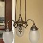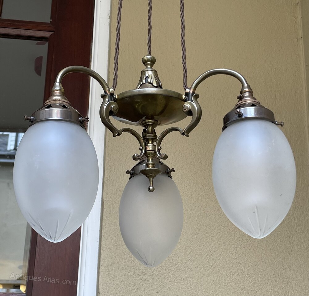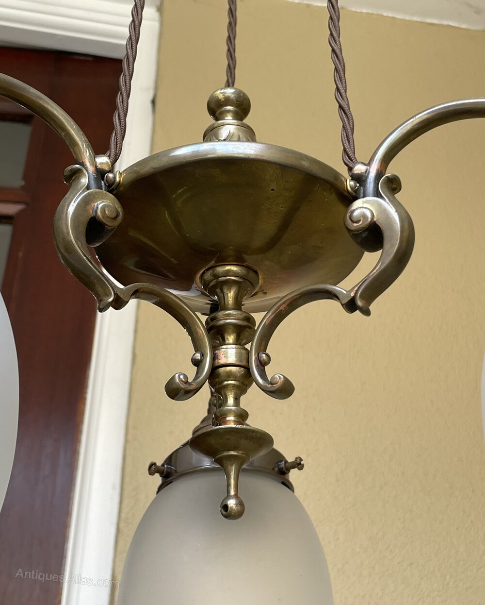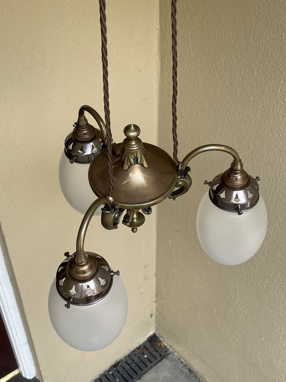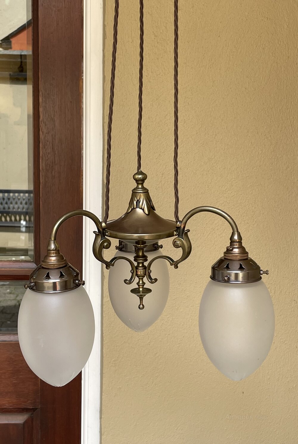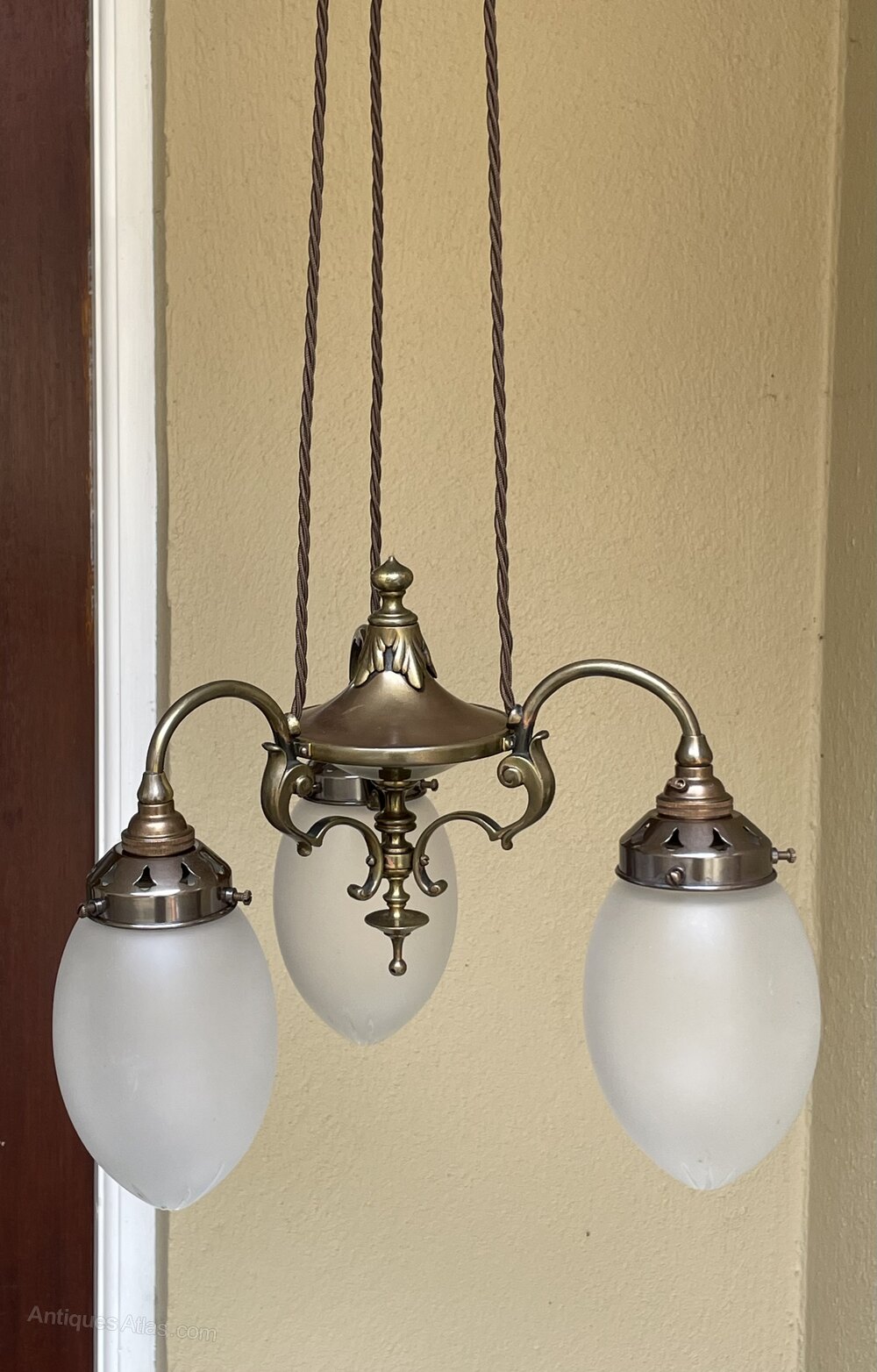 A stylish early 20th century brass chandelier of small proportions, unusually suspended on the three wires. Three scrolling arms with frosted pear shades with star cut glass detail. Fully rewired in period style braided flex and PAT safety tested.