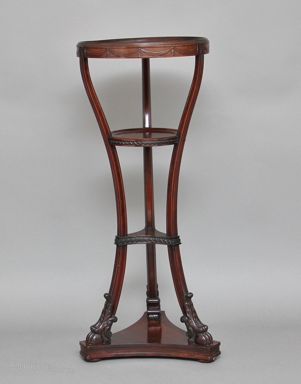 An early 20th Century carved mahogany four tier jardinere stand with a circular top, with three inverted fluted supports ending with hoof feet, each tier decorated on the outside with various carved swags and other carved patterns, standing on a tri-form base.