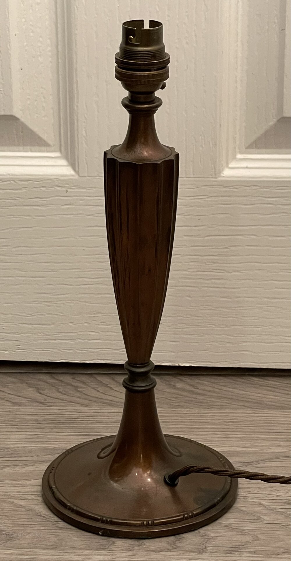 A very attractive early 20th century patinated copper table lamp of classical form, with fluted and tapered support, standing a circular base with gadrooned rim.