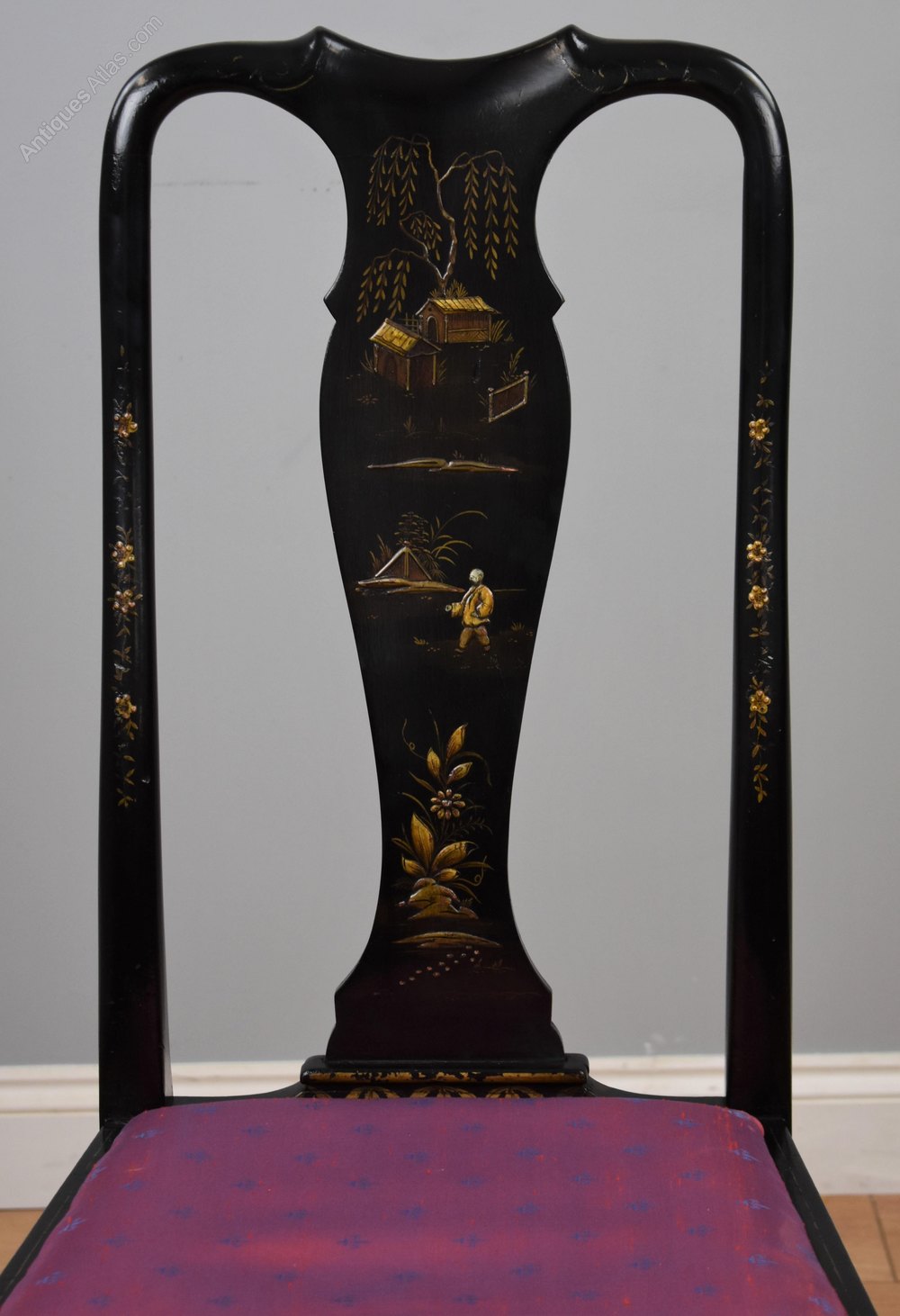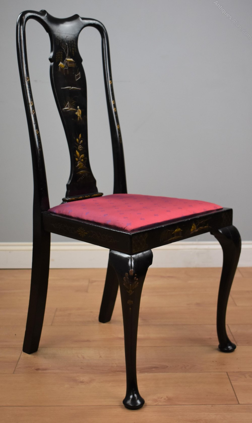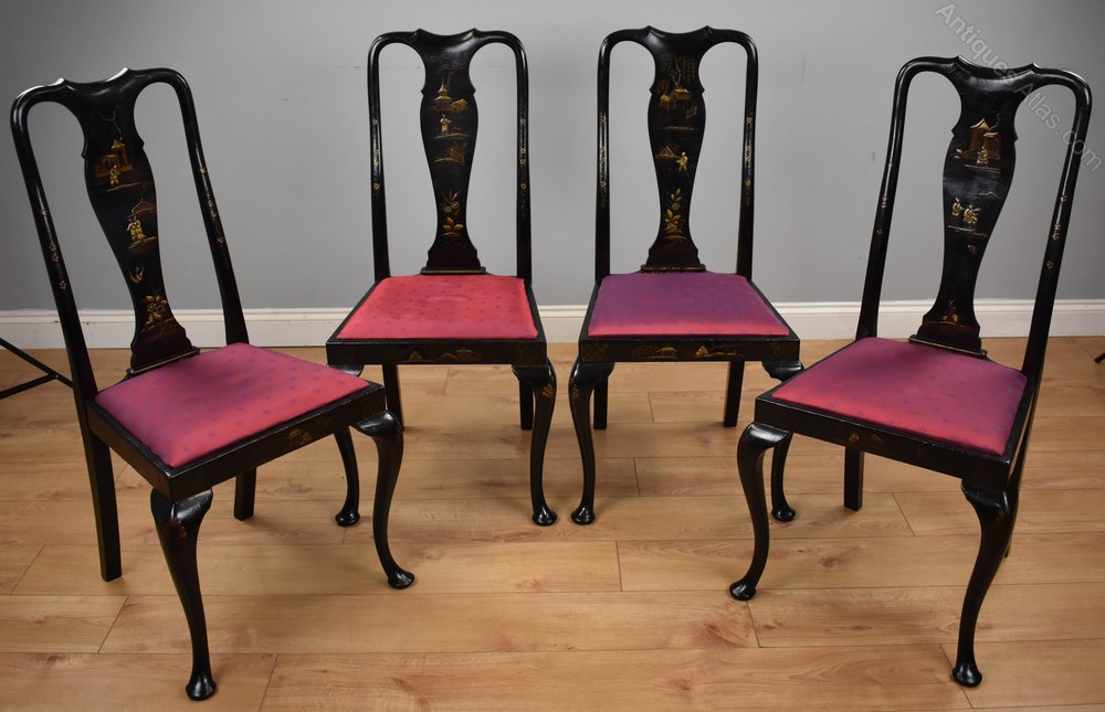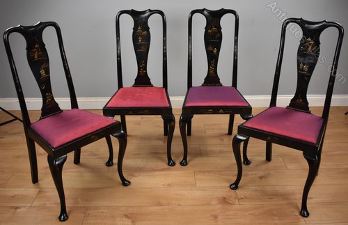 Early 20th Century set four Queen Anne Style chinoiserie chairs. Each chair is decorated with oriental figures and scenes, each chair having a different decoration. All the chairs are structurally sound in good condition with drop in seats.