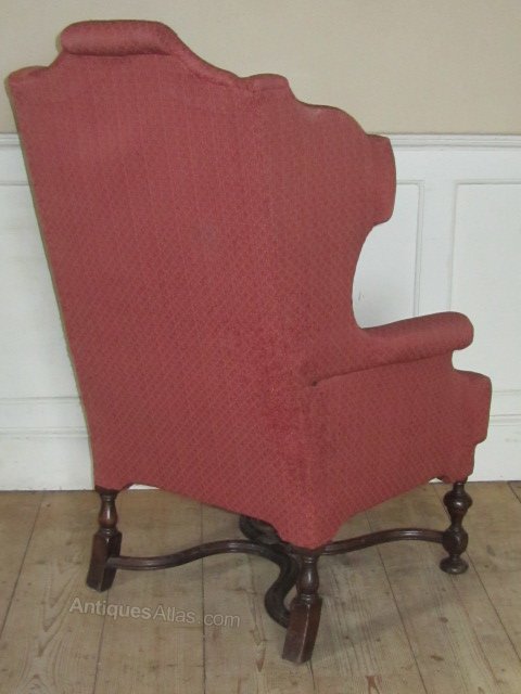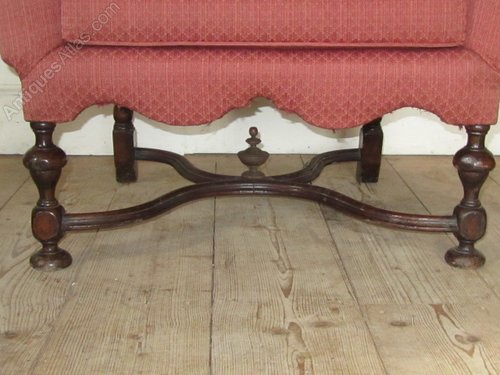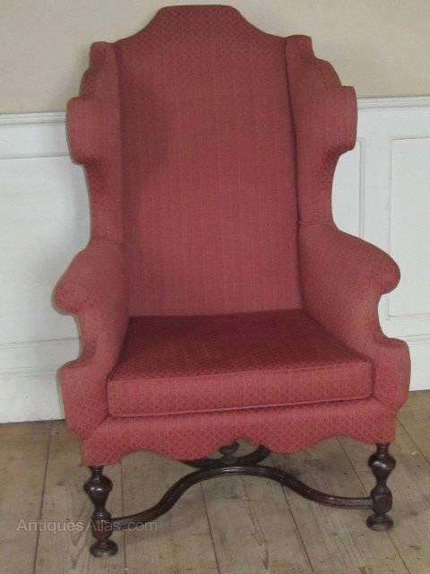 Early 20thc Queen Anne style wing back chair with walnut legs and x stretcher.
