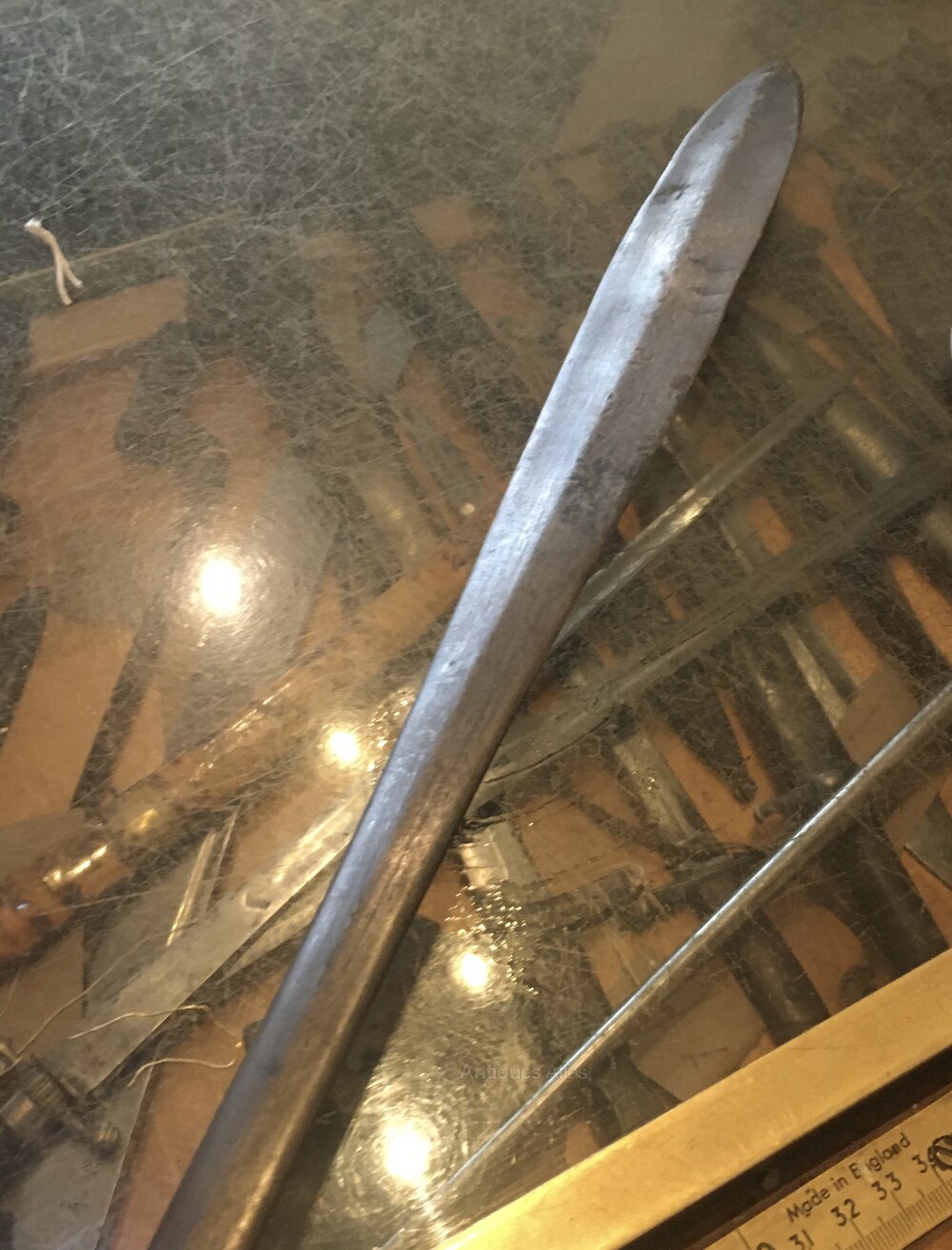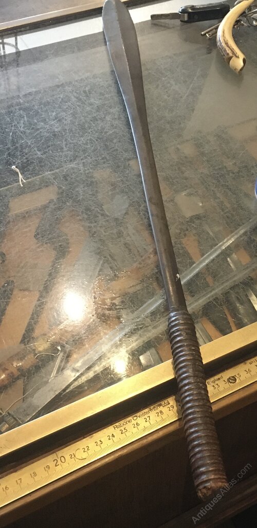 An early Masia sword. This is no tourist trinket it has a heavy hand forged blade still holding a good edge. a dark age patina overall with a turned handle “ wood” this has to be at least a hundred years old a good heavy weapon.
