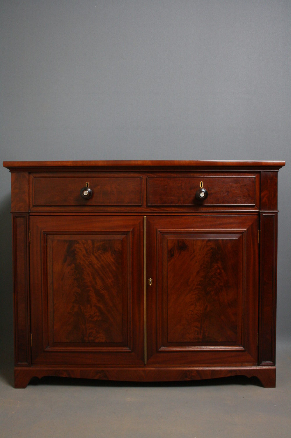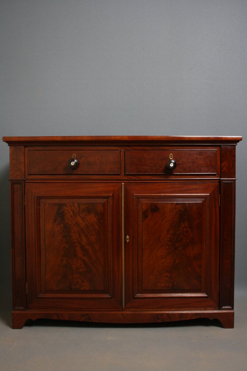 SN2184 Fine quality and very attractive Early Victorian mahogany chiffonier having figured mahogany top, 2 cockbeaded frieze drawers with turned knobs with mother of pearl centres, pair of flame mahogany, panelled cupboard doors, raised on bracket feet united by shaped apron. c1860