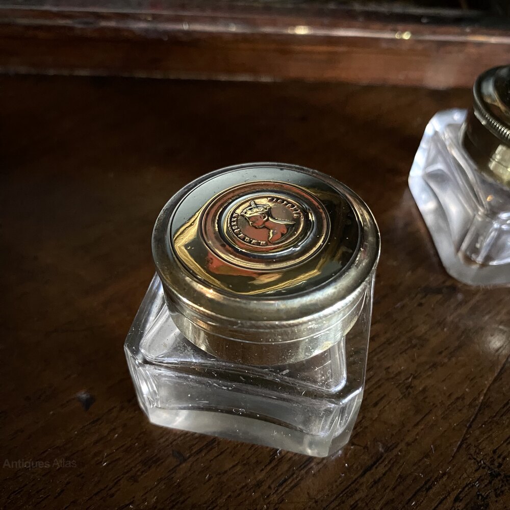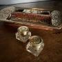 The stand holds two brass topped ink wells, each with screw off lid featuring a young bust of Victoria in the centre. The ink wells flank a bun handled lid section which is removed to reveal a small recess for writing materials.