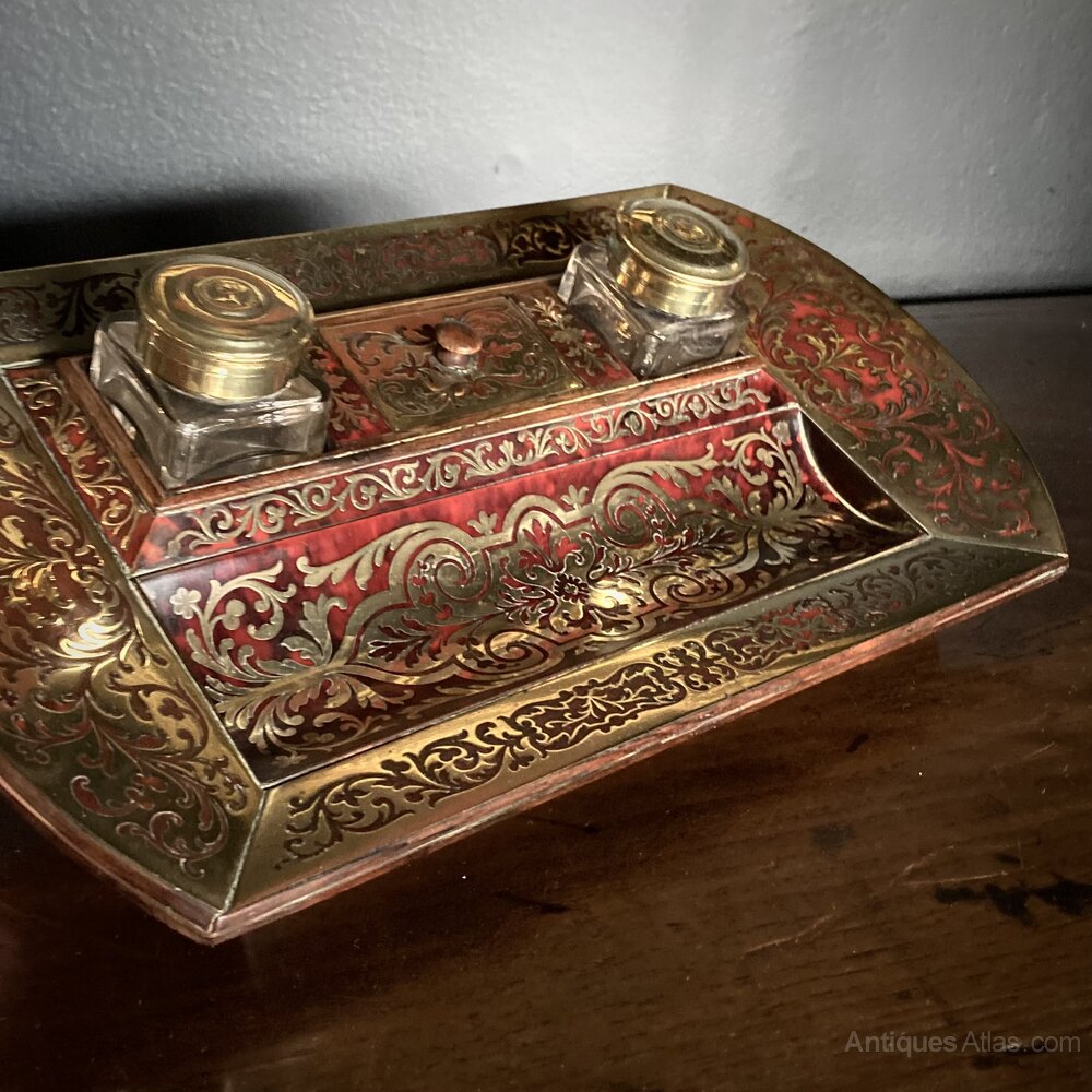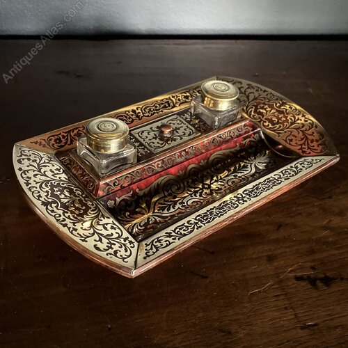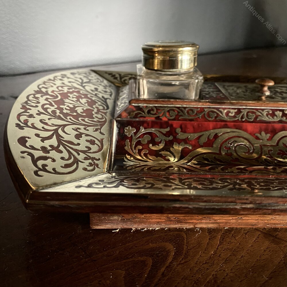 An exquisitely decorative English Boulle and Tortoise Shell Ink Stand. Circa 1850.