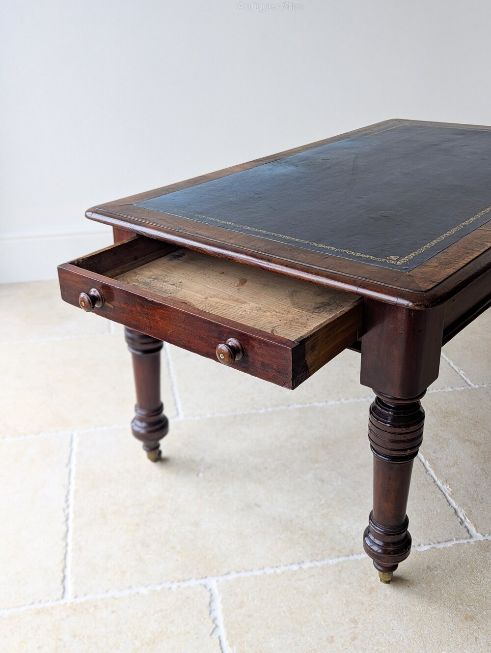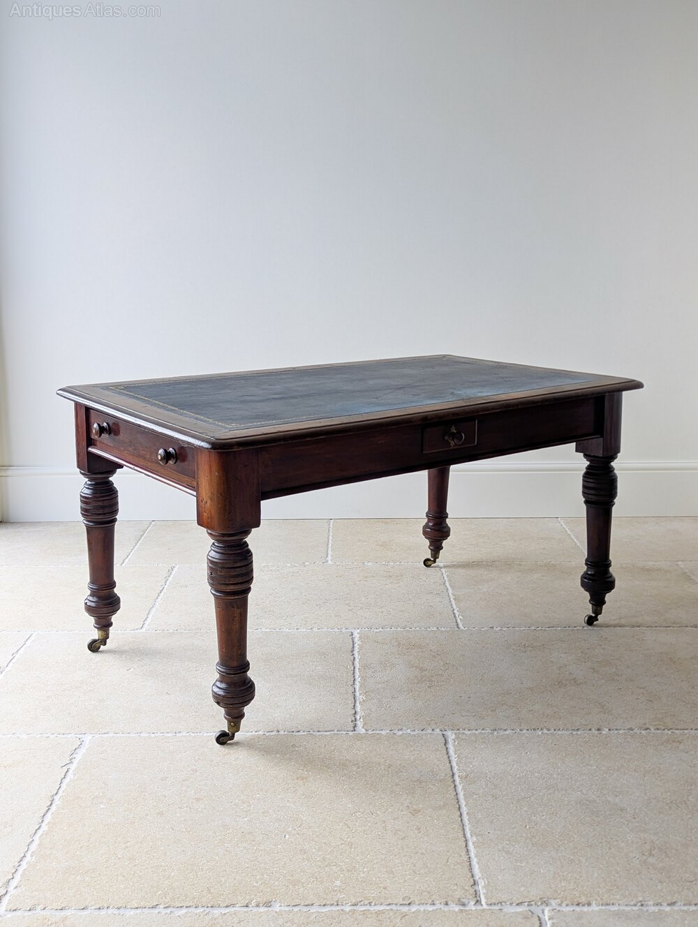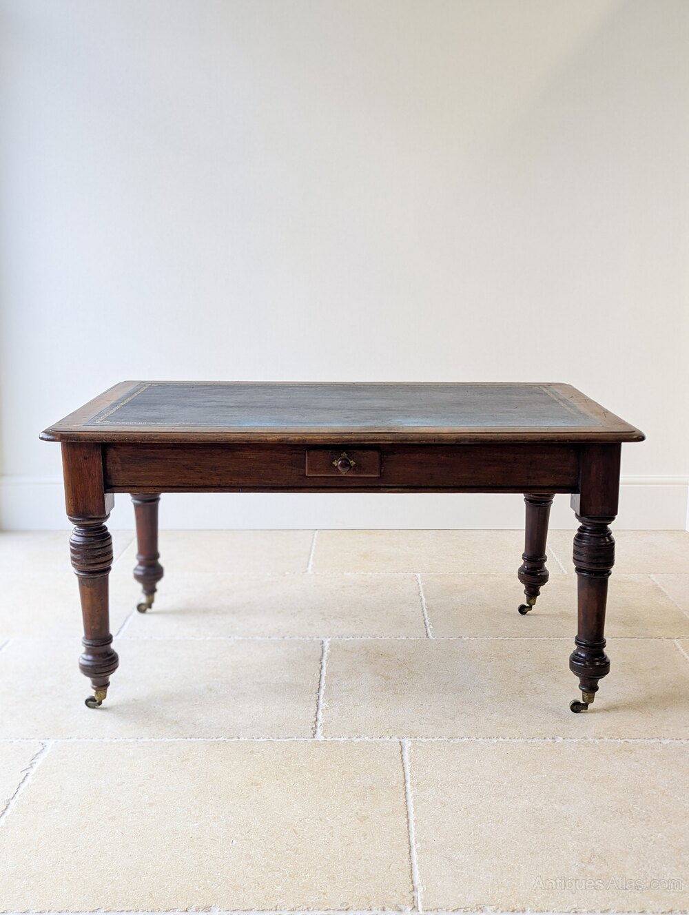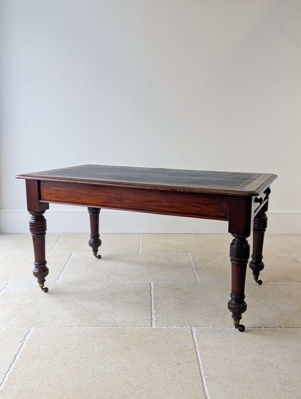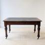 The piece is finished on all sides and raised on bold ring-turned legs terminating in original brass cup castors. A commanding and versatile library piece suitable for freestanding use and offering a generous working surface while remaining conveniently proportioned.