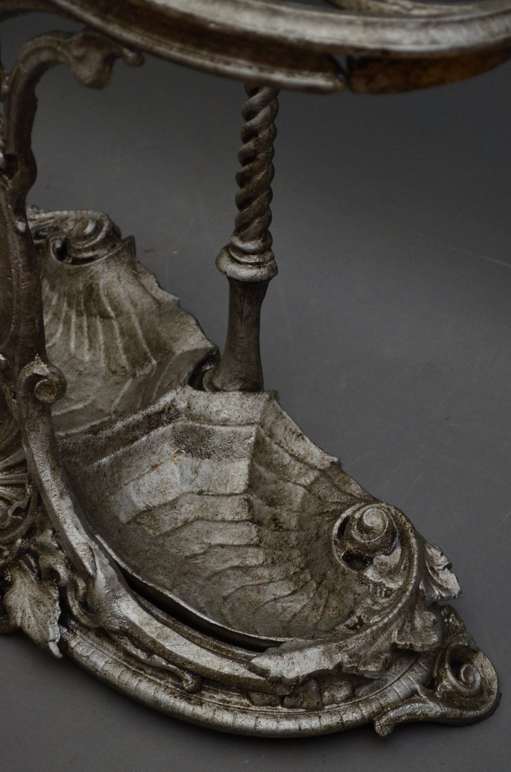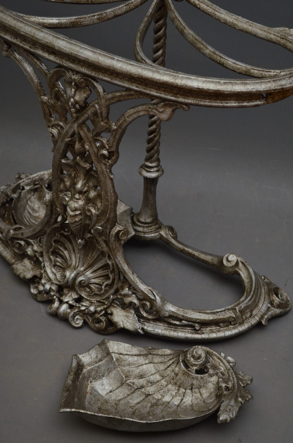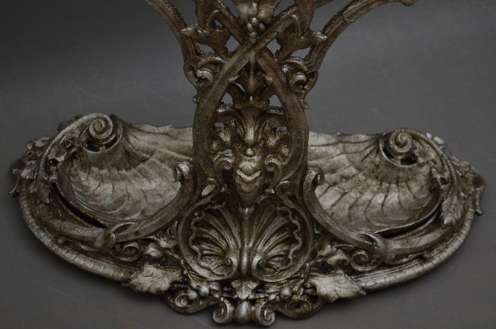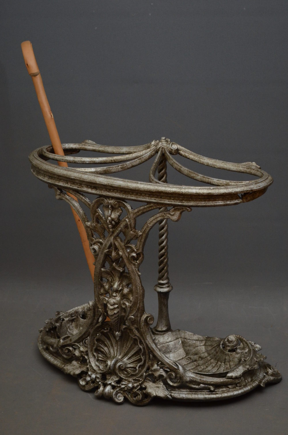Sn2923 Stylish and very decorative, early XX century, Continental cast iron stick stand / hall stand, having tear shape holders, intricate pierced design to front and 2 shell shape, removable trays to base, all supported on twisted column. c1920
