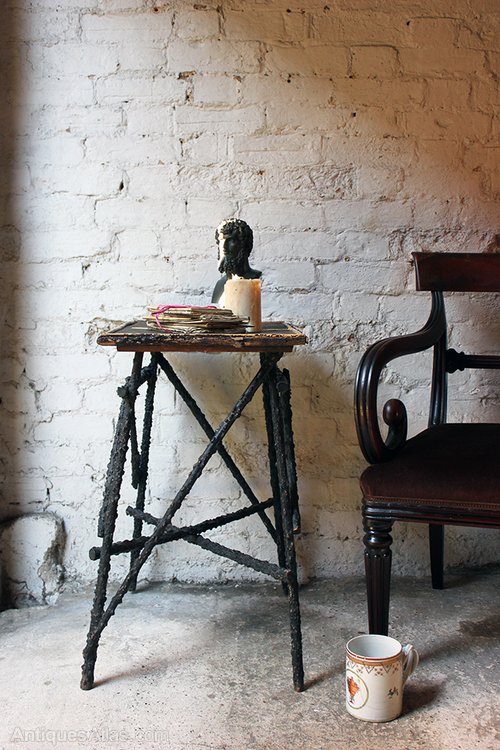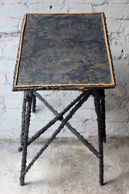 The rather rare Mid-Victorian occasional twig table having an ebony and gold chinoiserie decorated vellum(?) top on an ebonised naturalistic twig work support, the whole surviving from mid-Victorian England.