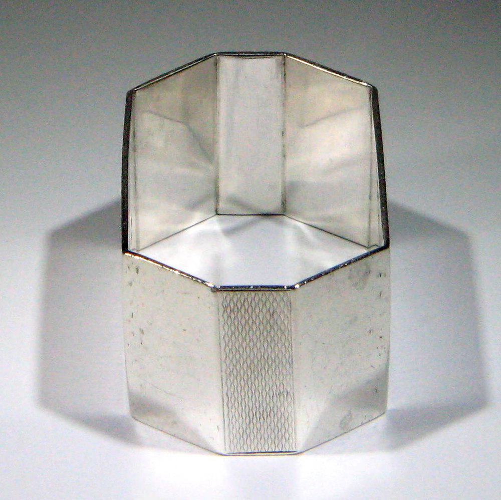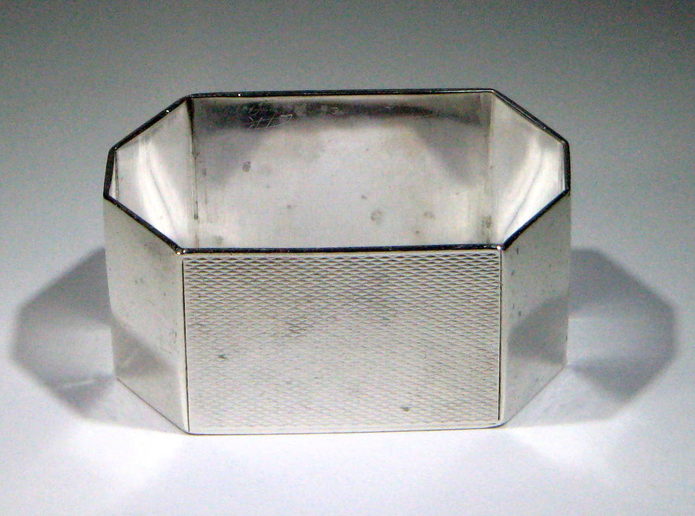Edward VII heavy silver napkin ring, octagonal with engine turned panelled decoration.