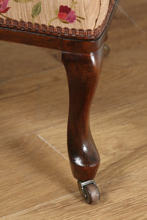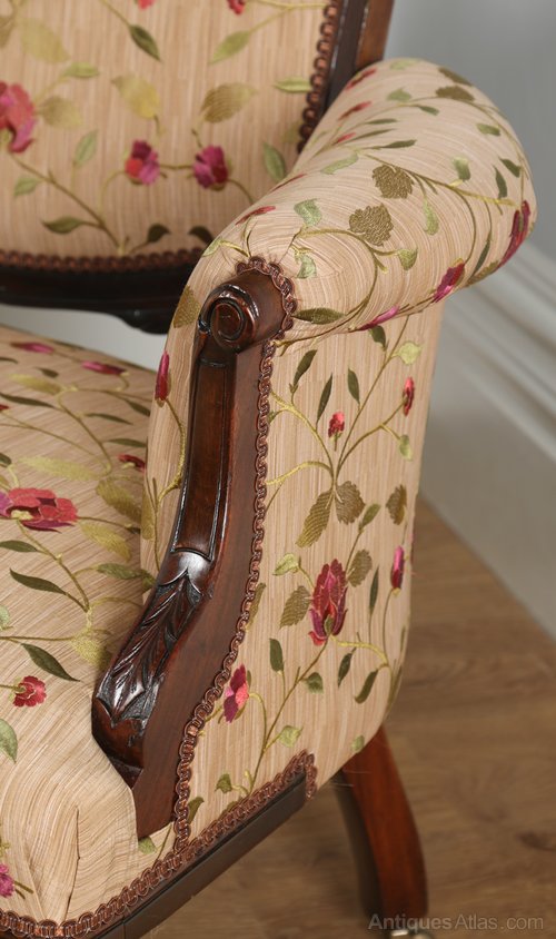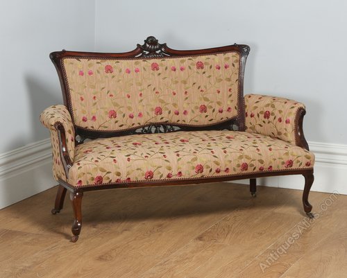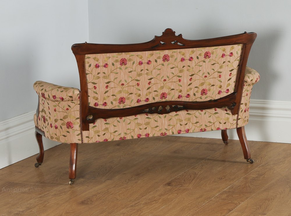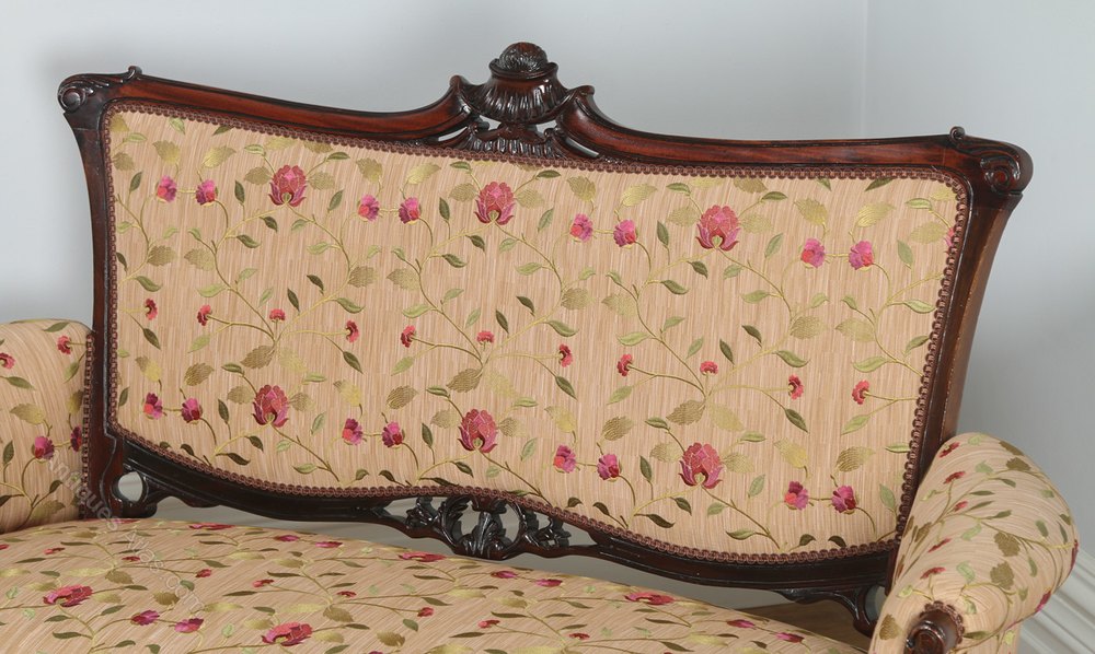 Condition This couch is in good condition. Nominal old use marks to the leading edges of the mahogany frame but nothing significant considering the age of the item. The couch has been newly upholstered in top quality structured silk and cotton embroidered upholstery, interspersed with pink and red flowers, pale green stems on a fawn colour background, finished with fine quality braiding to the frame. Therefore the upholstery is new and in excellent condition (it’s clean with no signs of wear and tear or damage). The seat is firmly sprung, but at the same time, is extremely comfortable. The underside is upholstered in traditional hessian. As the couch boasts the original polish it has a fantastic colour and patination. This colour can only be achieved through age and years of care and cleaning it has received. The back and arms are also in good condition with no loose joints, and no missing carvings. This couch is well constructed, solid in joint and is ready to use.