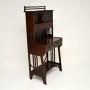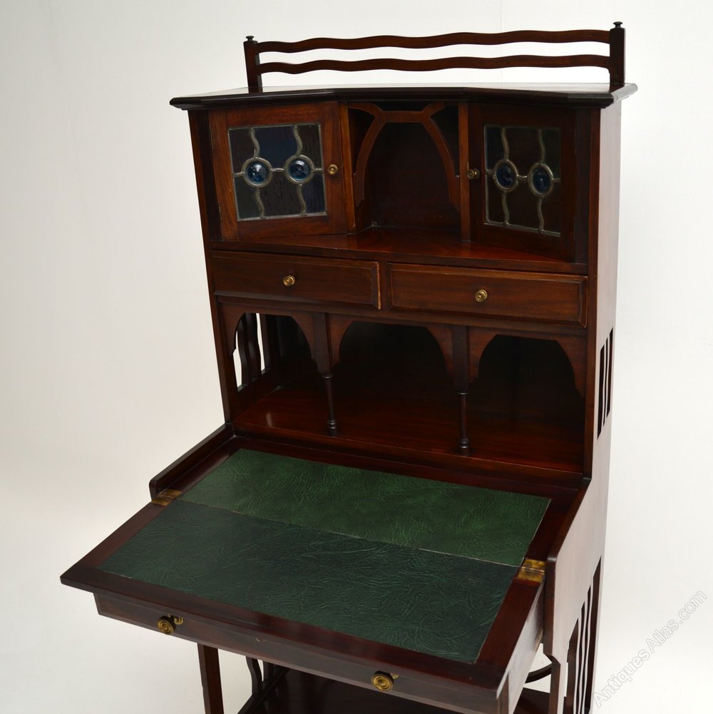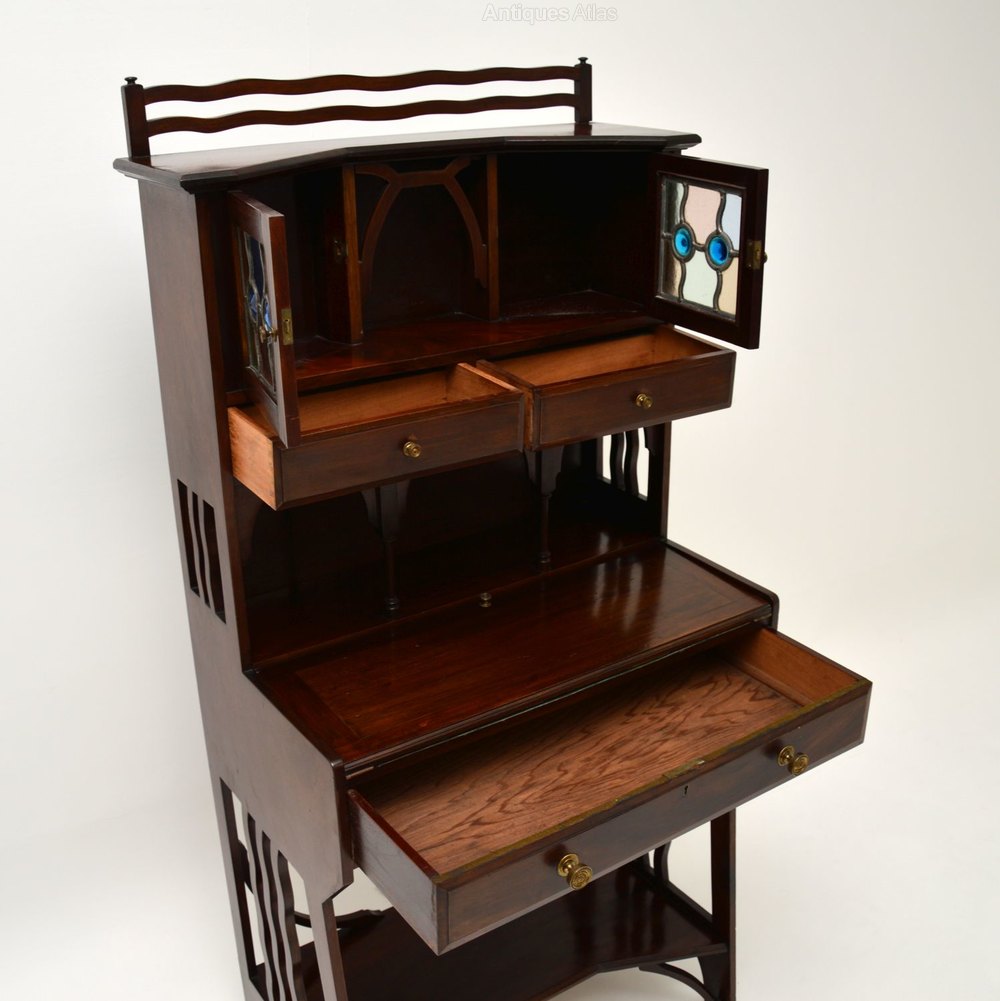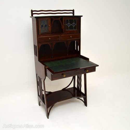 This is of excellent quality and has a beautiful design. The writing surface flips out and rests on the open drawer. There is additional storage in the top, with two drawers and two glass fronted doors. The glass is astral glazed with lovely colours and blue segments, this has original brass handles and is very well made throughout. The writing surface is green leatherette, which was probably re-done a long time ago.