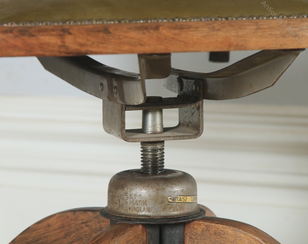 The chair and mechanism are in excellent condition, considering its age. Nominal old use marks to the leading edges of the chair but nothing significant considering the age of the item. The chair seat has been newly upholstered, to a professional standard, in top quality full grain sage green leather, which incorporates the traditional brass studwork tacks to the seat perimeter. Therefore, the leather is in excellent condition, with no wear, fading or damage. The Hillcrest reclining and adjustable height mechanism is in good working order, having just been cleaned, restored and serviced. There is some play to the mechanism but this is perfectly acceptable, and in line with the age of the chair. The chair features a mellow beech colour, having been professionally French polished, by hand, in our workshops. The chair features the original steel castors, which are also in excellent condition. This item is solid in joint and ready to use.