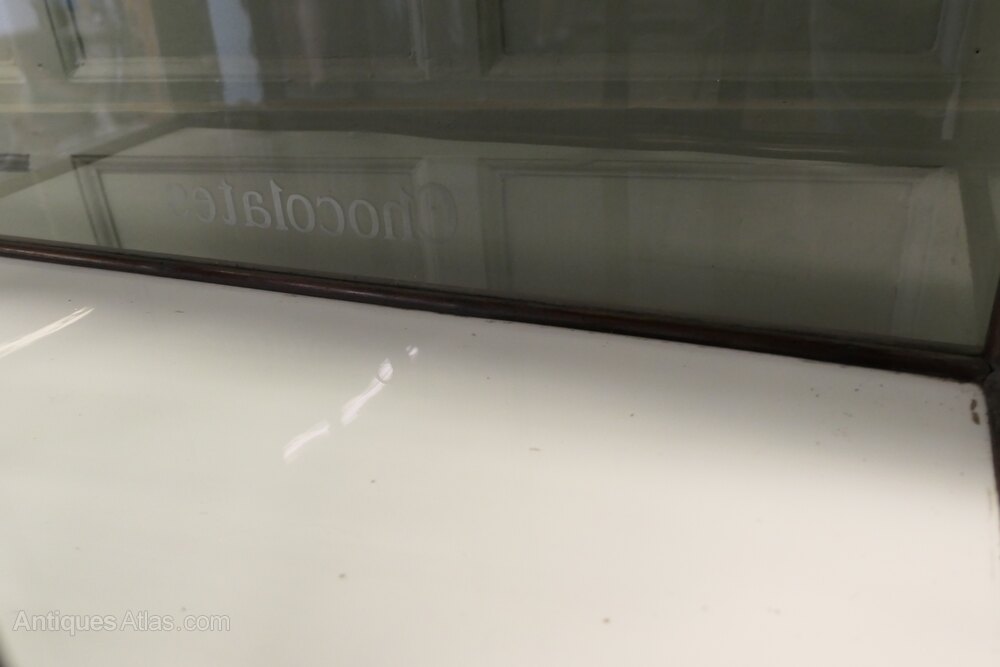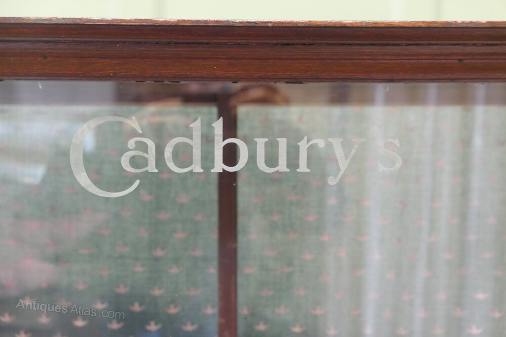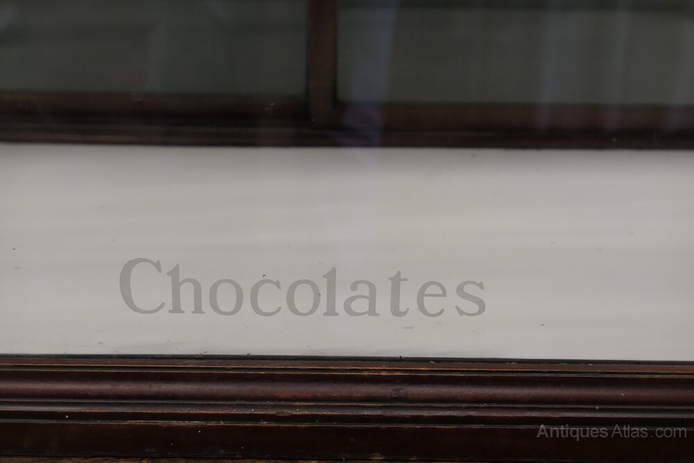 This glazed Shop Display Cabinet has etched glass lettering on the front of the cabinets saying Cadbury’s at the top and Chocolates at the bottom
