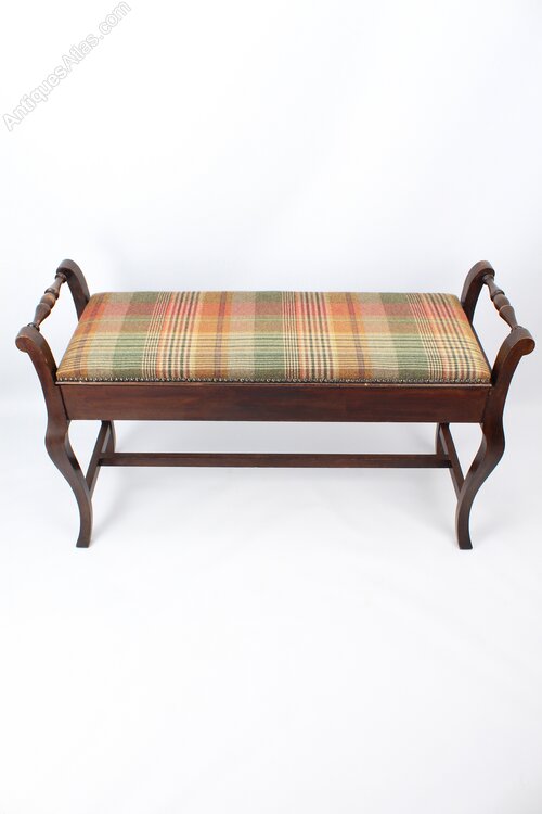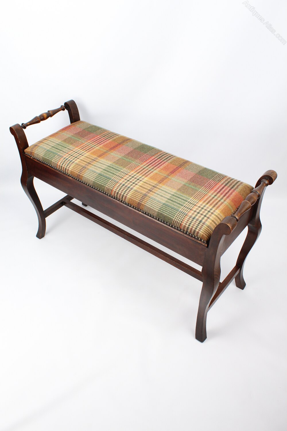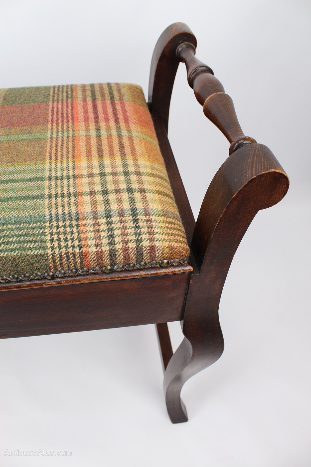An elegant good sized antique Edwardian duet piano stool with cabriole legs dating from circa 1910. Featuring two turned carry handles, it has a lift up lid revealing space inside for storage. The seat has been recently recovered in a Welsh Blanket type fabric and finished with brass studs. Stamped with makers number below.