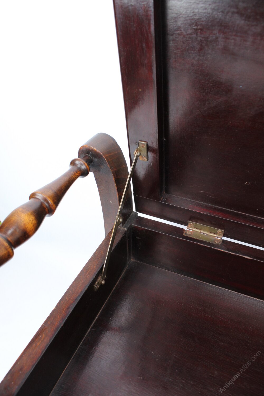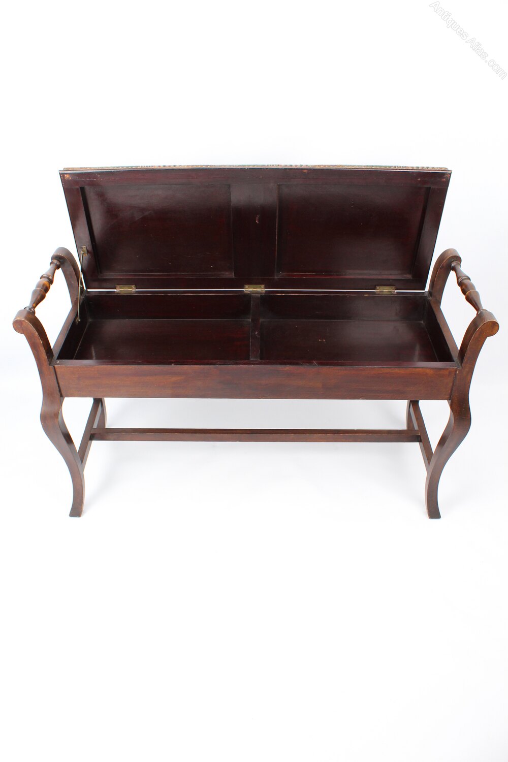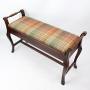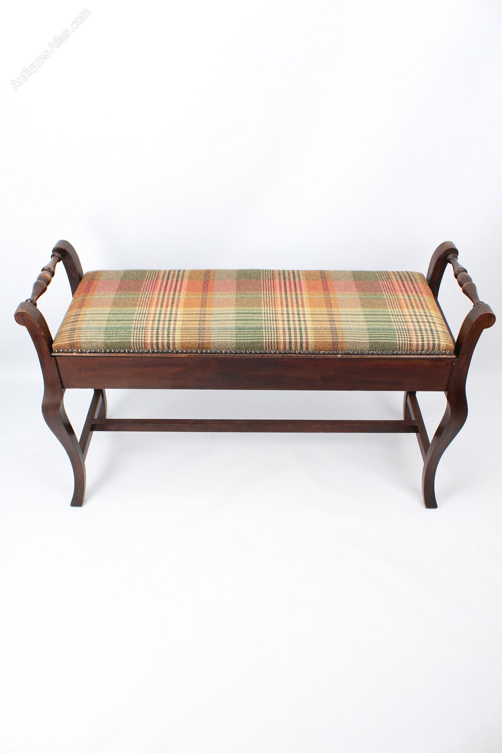An elegant good sized antique Edwardian duet piano stool with cabriole legs dating from circa 1910. Featuring two turned carry handles, it has a lift up lid revealing space inside for storage. The seat has been recently recovered in a Welsh Blanket type fabric and finished with brass studs. Stamped with makers number below.