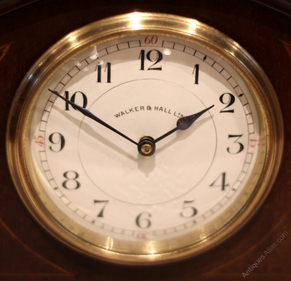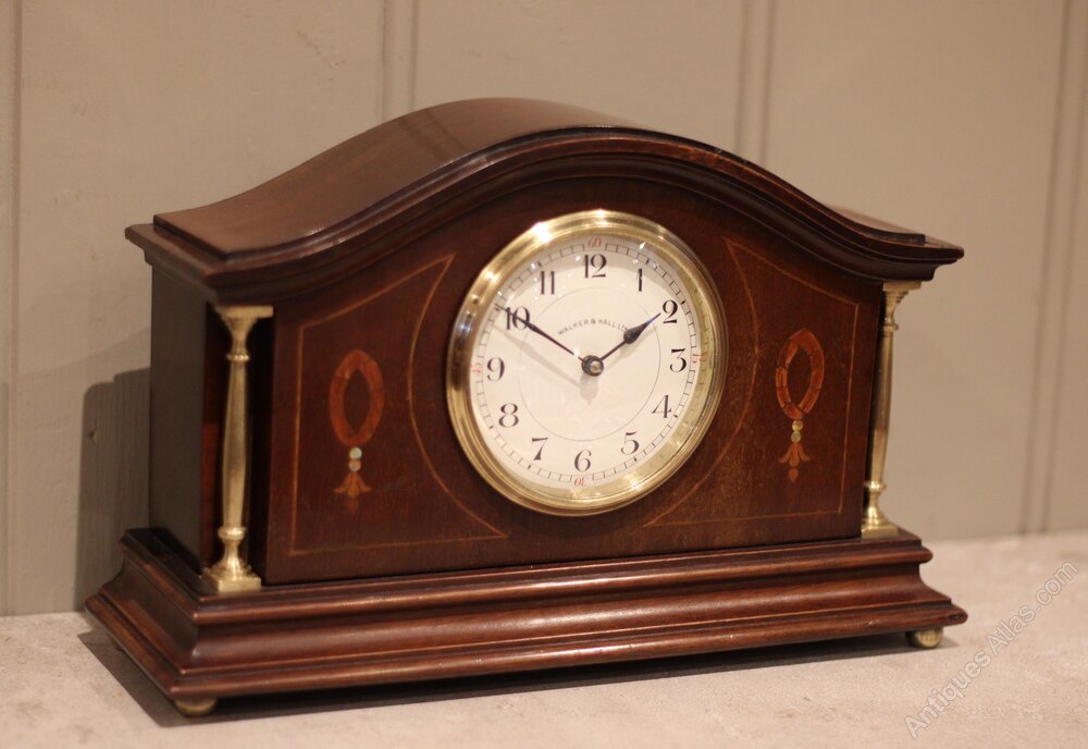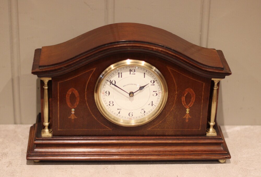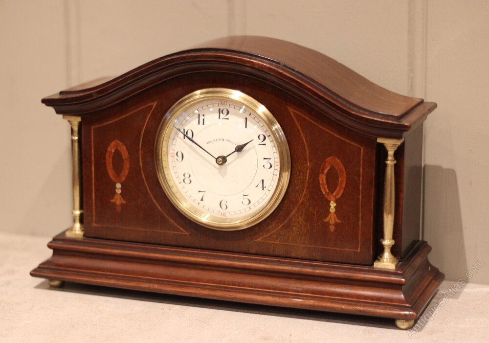 An Edwardian solid mahogany mantel antique clock, having a swept arch top case, with a floral inlay decoration and brass side columns. It has a French 8 day timepiece lever platform movement, with an enamel dial that is signed by the original retailers Walker & Hall.