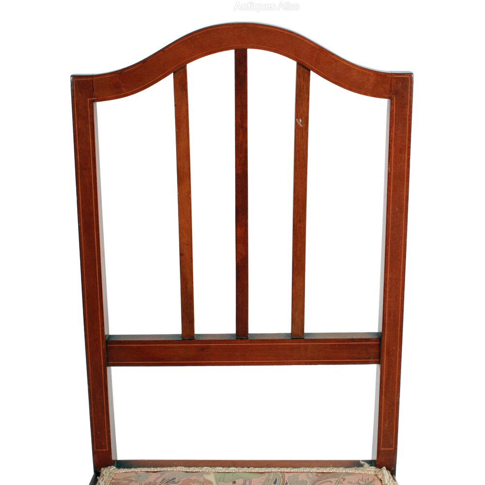 The chair back has a domed top rail and three vertical rails that are all decorated with box wood line inlays.