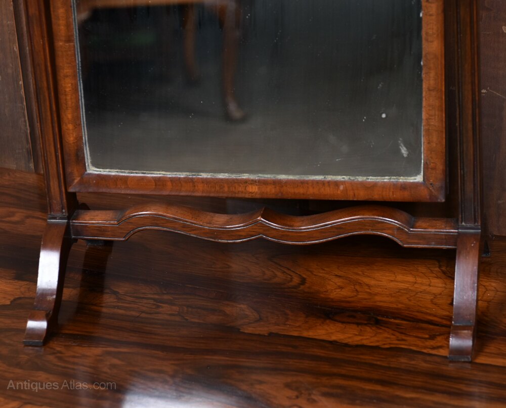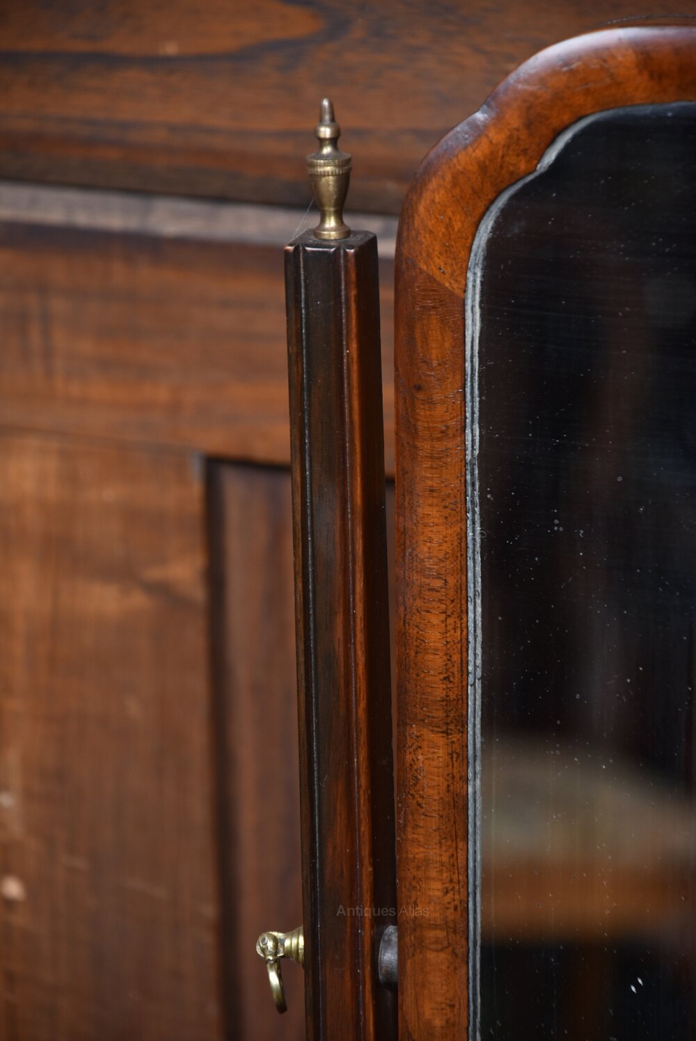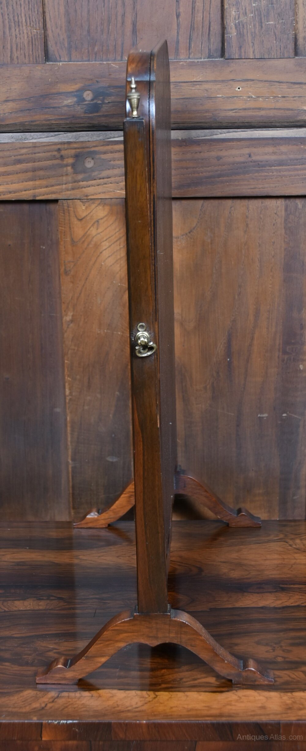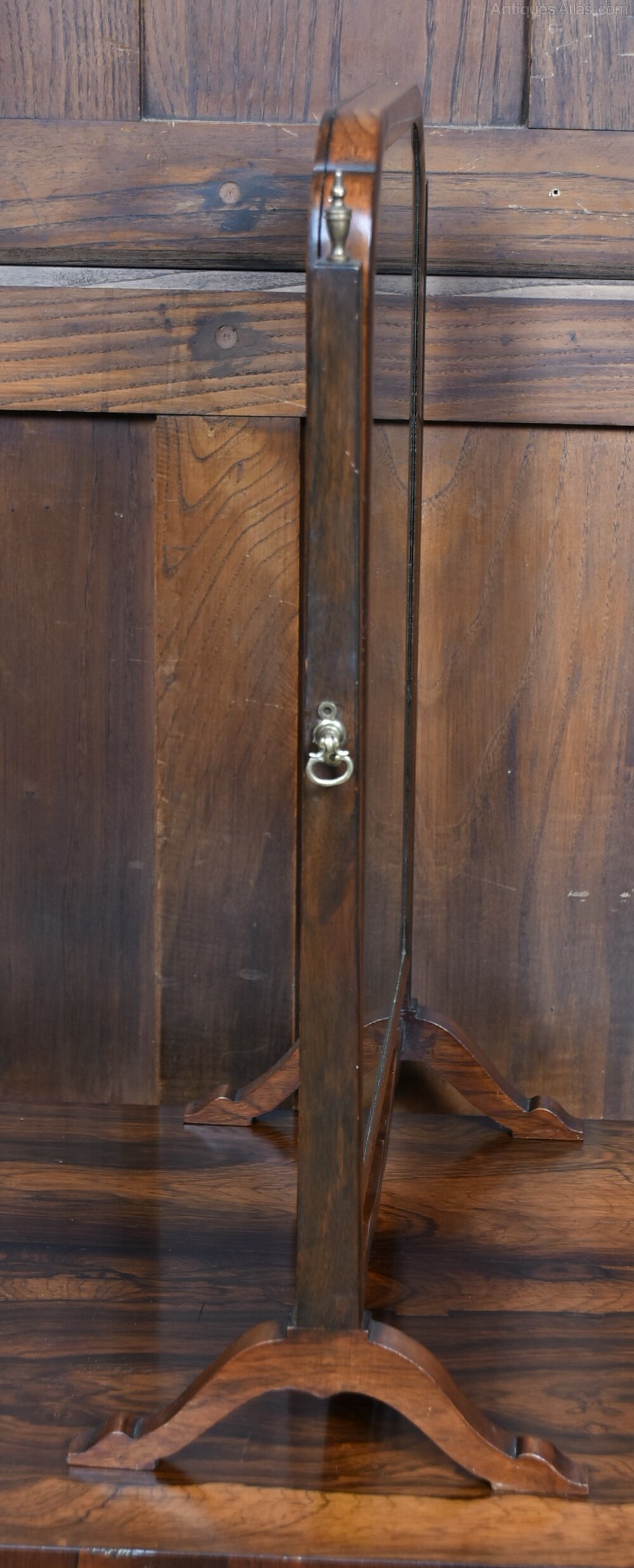 Wonderful Edwardian mahogany dressing table mirror in superb antique condition. The mirror plate displays desirable aged foxing and is bordered in an attractive mahogany frame. The mirror is supported by square upright with brass finials on top and brass rings to hold the mirror at the desired angle. Like all antiques there are some imperfections however this is a solid well proportion dressing table mirror that will provide many more years of use and add the perfect touch of history to any room.